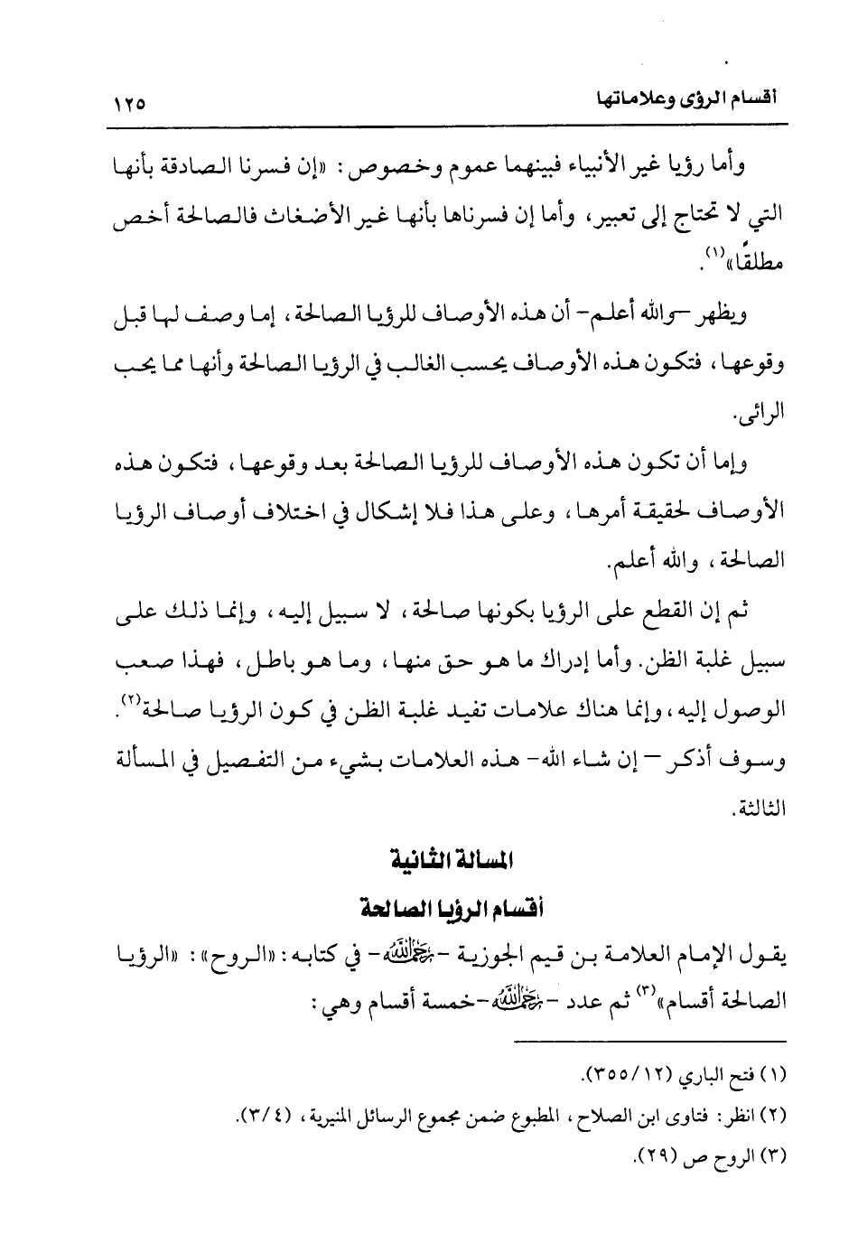 يقول الإمام العلامة ابن قيم الجوزية رحمه الله في كتابه "الروح": (الرؤيا الصالحة أقسام) (¬3) ثم عدد رحمه الله خمسة أقسام وهي: