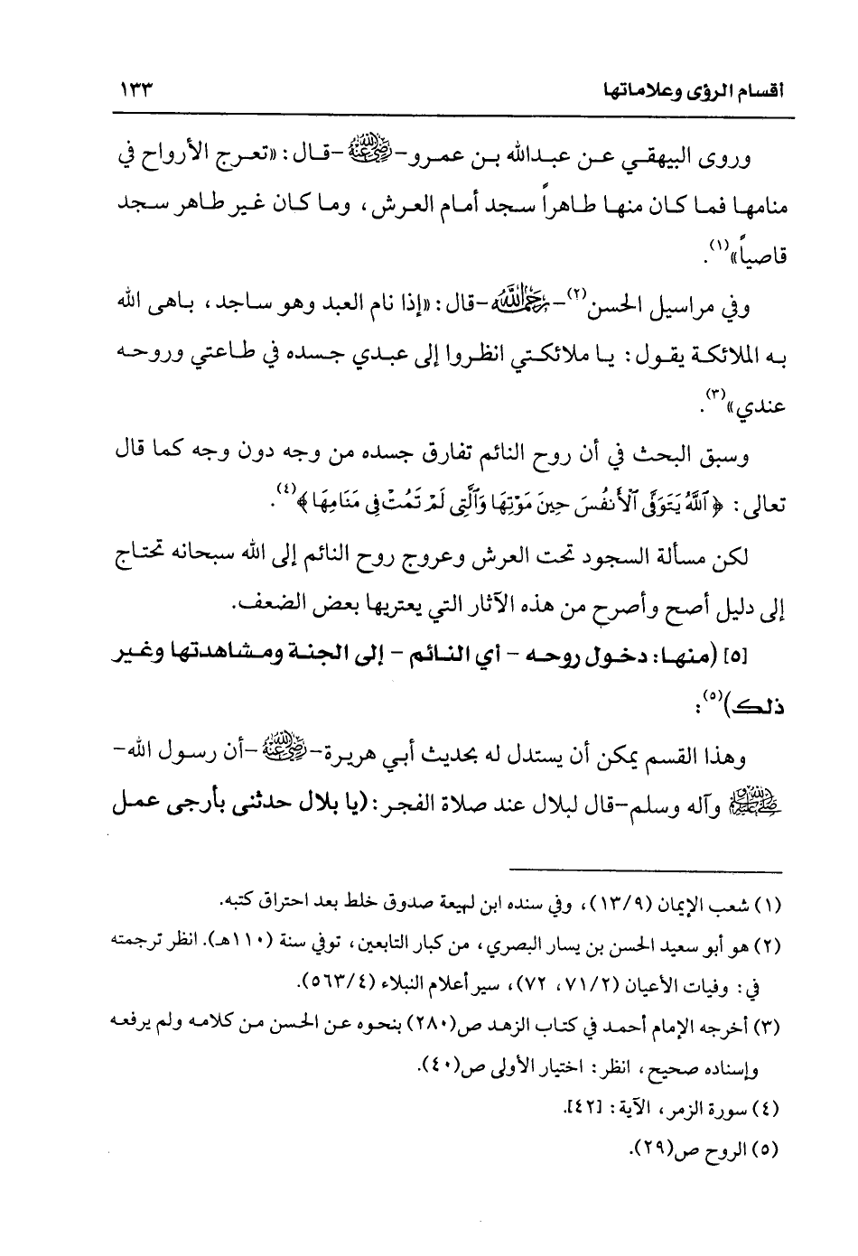 وروى البيهقي عن عبد الله بن عمرو رضي الله عنه قال: (تعرج الأرواح في منامها فما كان منها طاهرًا سجد أمام العرش، وما كان غير طاهر سجد قاصيًا) (¬1).