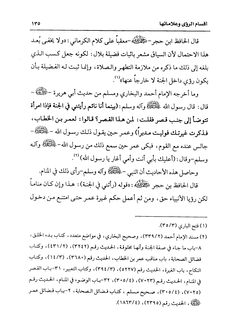 (¬2) مسند الإمام أحمد (2/ 339) وصحيح البخاري في مواضع متعددة كتاب بدء الخلق 8 - باب ما جاء في صفة الجنة وأنها مخلوقة الحديث (3242) (2/ 431) وكتاب فضائل الصحابة باب مناقب عمر بن الخطاب (3680) (3/ 14) وكتاب النكاح باب الغيرة الحديث (5227) (3/ 394) وكتاب التعبير 31 - باب القصر في المنام الحديث (7023) (4/ 305) 32 - باب الوضوء في المنام الحديث رقم 7025, 4/ 305 صحيح مسلم، كتاب فضائل الصحابة، 2 - باب فضائل عمر رضي الله عنه الحديث (2395) (4/ 1863).