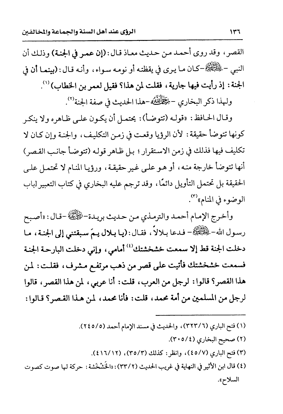وأخرج الإمام أحمد والترمذي من حديث بريدة رضي الله عنه قال: (أصبح رسول الله - صلى الله عليه وسلم - فدعا بلالاً فقال: «يا بلال بمَ سبقتني إلى الجنة، ما دخلت الجنة قط، إلا سمعت خشخشتك (¬4) أمامي، وإني دخلت البارحة الجنة فسمعت خشخشتك فأتيت على قصر من ذهب مرتفع مشرف، فقل: لمن هذا القصر؟ قالوا: لرجل من العرب، قلت: أنا عربي، لمن هذا القصر، قالوا لرجل