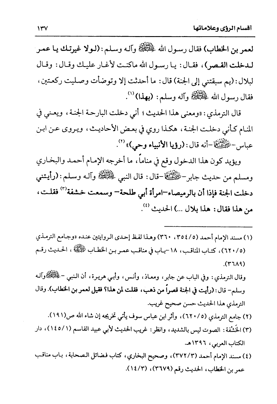ويؤيد كون هذا الدخول وقع في منام، ما أخرجه الإمام أحمد والبخاري ومسلم من حديث جابر رضي الله عنهما قال: قال النبي صلى الله عليه وآله وسلم: «رأيتني دخلت الجنة فإذا أنا بالرميصاء امرأة أبي طلحة، وسمعت خَشْفة (¬3) فقلت، من هذا فقال: هذا بلال ...» الحديث (¬4).