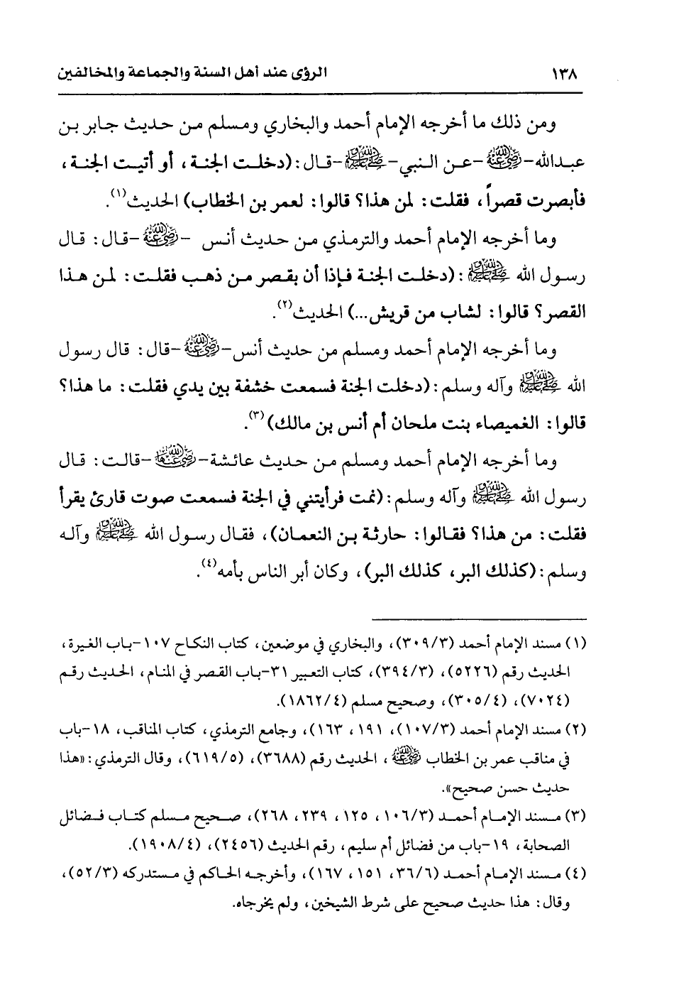 ومن ذلك ما أخرجه الإمام أحمد والبخاري ومسلم من حديث جابر بن عبد الله رضي الله عنه عن النبي صلى الله عليه وآله وسلم قال: «دخلت الجنة، أو أتيت الجنة، فأبصرت قصرًا، فقلت: لمن هذا؟ قالوا: لعمر بن الخطاب» الحديث (¬1).