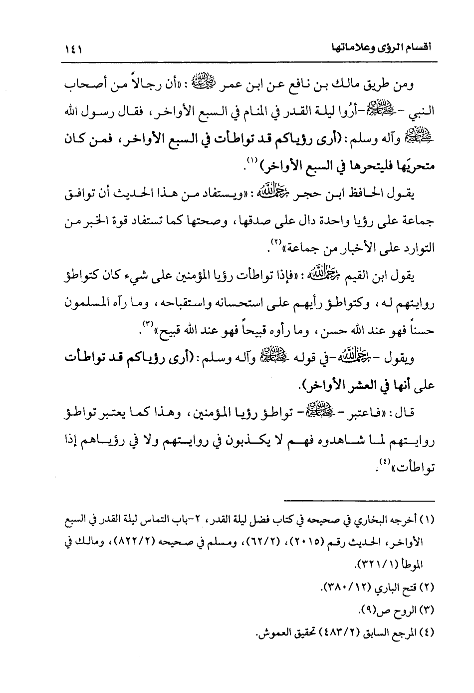 ويقول رحمه الله في قوله صلى الله عليه وآله وسلم: «أرى رؤياكم قد تواطأت على أنها في العشر الأواخر».