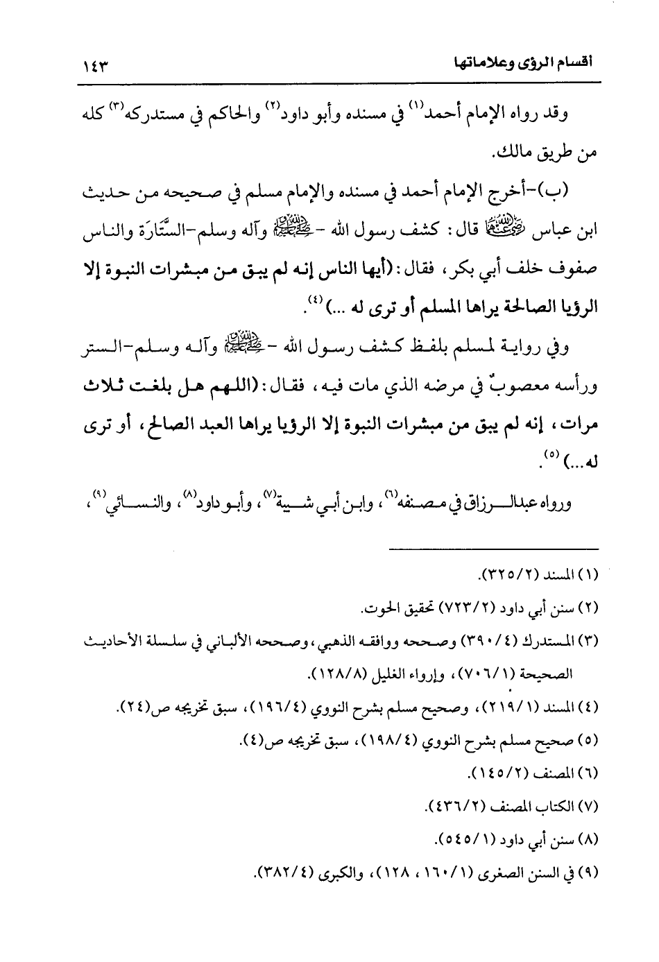 (ب) أخرج الإمام أحمد في مسنده والإمام مسلم في صحيحه من حديث ابن عباس رضي الله عنهما قال: كشف رسول الله صلى الله عليه وآله وسلم الستارة والناس صفوف خلف أبي بكر فقال: «أيها الناس إنه لم يبق من مبشرات النبوة إلا الرؤيا الصالحة يراها المسلم أو ترى له ...» (¬4).