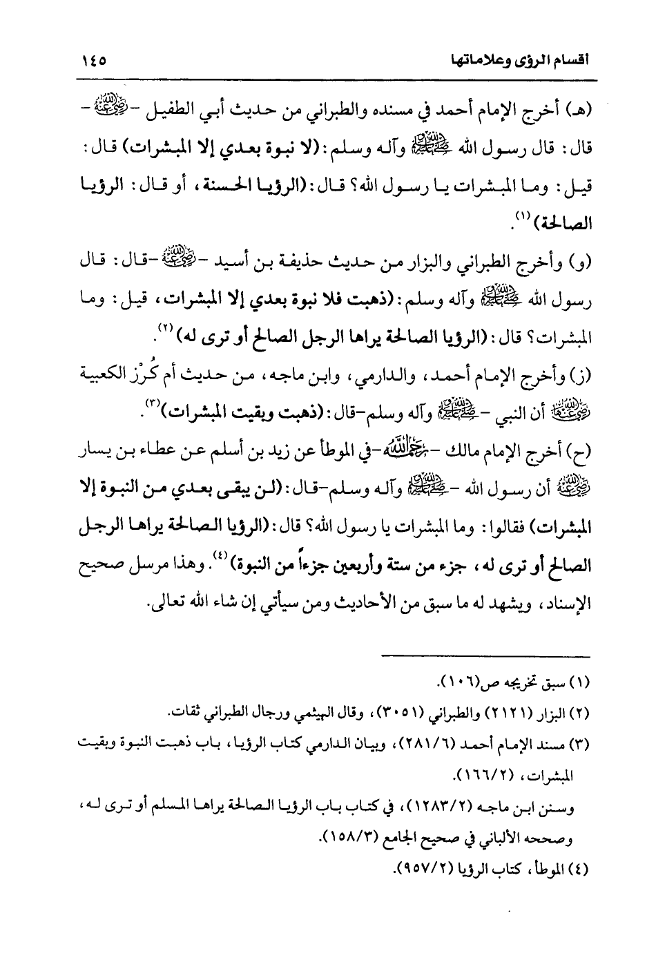 (¬3) مسند الإمام أحمد (6/ 281) وبيان الدارمي كتاب الرؤيا، باب ذهبت النبوة وبقيت المبشرات (2/ 166).