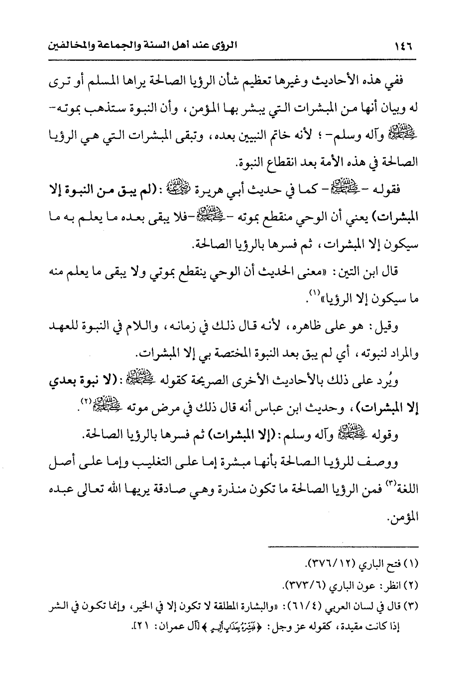 ووصف الرؤيا الصالحة بأنها مبشرة إما على التغليب وإما على أصل اللغة (¬3) فمن الرؤيا الصالحة ما تكون منذرة وهي صادقة يريها الله تعالى عبده المؤمن.