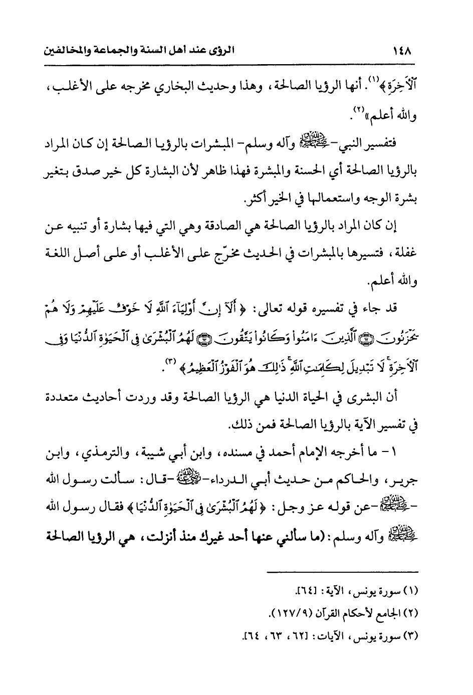 1 - ما أخرجه الإمام أحمد في مسنده وابن أبي شيبة، والترمذي، وابن جرير، والحاكم من حديث أبي الدرداء رضي الله عنه قال: سألت رسول الله - صلى الله عليه وسلم - عن قوله عز وجل: {لَهُمُ الْبُشْرَى فِي الْحَيَاةِ الدُّنْيَا} فقال رسول الله صلى الله عليه وآله وسلم: «ما سألني عنها أحد غيرك منذ أنزلت، هي الرؤيا الصالحة