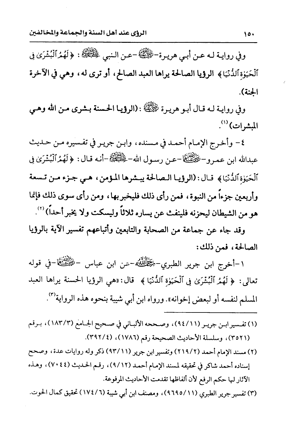 1 - أخرج ابن جرير الطبري رحمه الله عن ابن عباس رضي الله عنهما في قوله تعالى: {لَهُمُ الْبُشْرَى فِي الْحَيَاةِ الدُّنْيَا} قال: (هي الرؤيا الحسنة يراها العبد المسلم لنفسه أو لبعض إخوانه) ورواه ابن أبي شيبة بنحوه هذه الرواية (¬3).