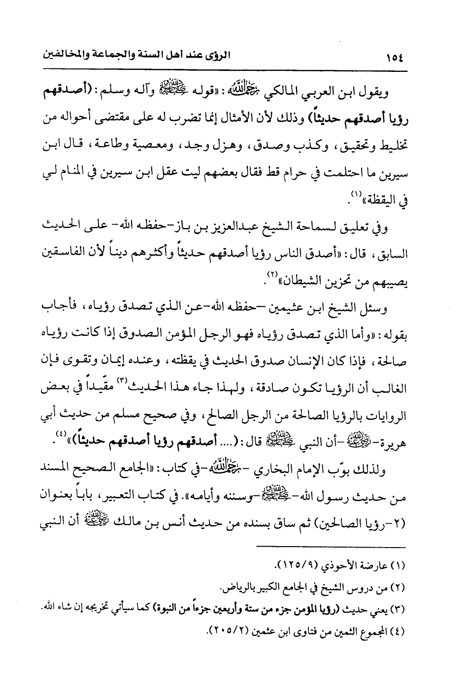 ويقول ابن العربي المالكي رحمه الله: قوله صلى الله عليه وآله وسلم «أصدقهم رؤيا أصدقهم حديثًا» وذلك لأن الأمثال إنما تضرب له على مقتضى أحواله من تخليط وتحقيق، وكذب وصدق، وهزل وجد ومعصية وطاعة، قال ابن سيرين ما احتلمت في حرام قط، فقال بعضهم ليت عقل ابن سيرين في المنام لي في اليقظة (¬1).
