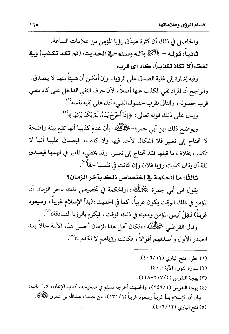 ويوضح ذلك ابن أبي جمرة رحمه الله بأن عدم كذبها أنها تقع بينة واضحة لا تحتاج إلى تعبير فلا إشكال لأحد فيها ولا كذب، فيصدق عليها أنها لا كذب بخلاف ما قبلها فقد تحتاج إلى تعبير، وقد يخطئ المعبر في فهمها فيصدق لغة أن يقال كذبت رؤيا فلان وإن كانت في نفسها حقًا (¬2).