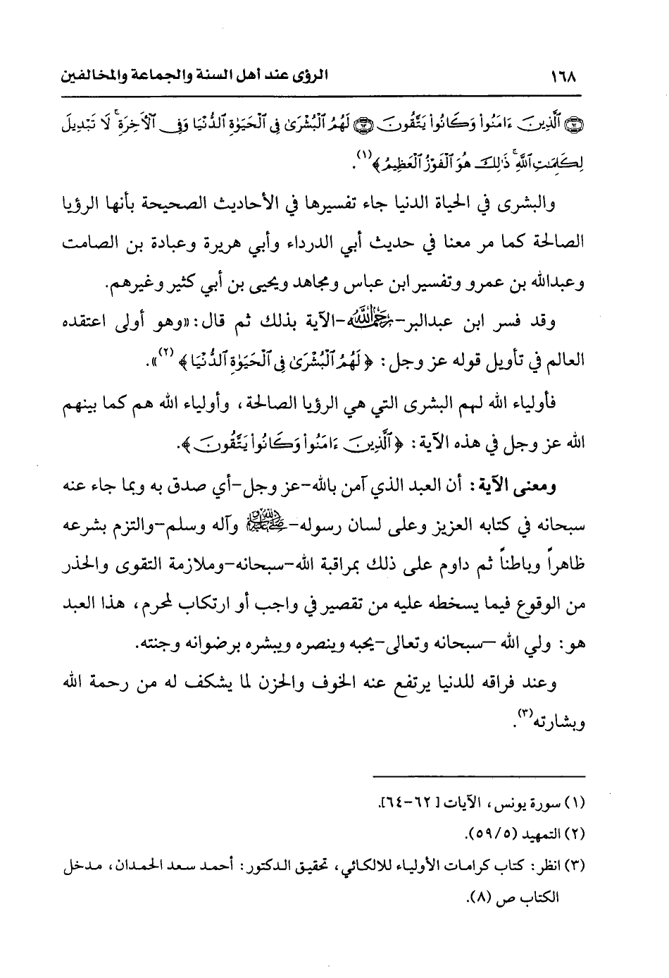 فأولياء الله لهم البشرى التي هي الرؤيا الصالحة، وأولياء الله هم كما بينهم الله عز وجل في هذه الآية {الَّذِينَ آمَنُوا وَكَانُوا يَتَّقُونَ}.