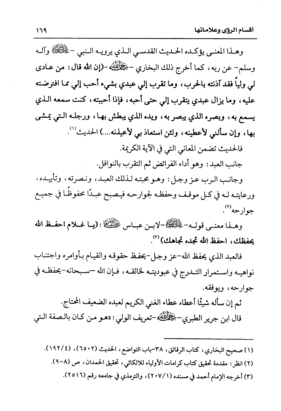 وهذا المعنى يؤكده الحديث القدسي الذي يرويه النبي صلى الله عليه وآله وسلم عن ربه كما أخرج ذلك البخاري رحمه الله: «إن الله قال: من عادى لي وليًا فقد آذنته بالحرب، وما تقرب إلى عبدي بشيء أحب إلي مما افترضته عليه، وما يزال عبدي يتقرب إلي حتى أحبه، فإذا أحببته، كنت سمعه الذي يسمع به، وبصره الذي يبصر به، ويده التي يبطش بها، ورجله التي يمشي بها، وإن سألني لأعطينه ولئن استعاذ بي لأعيذنه ...» الحديث (¬1).