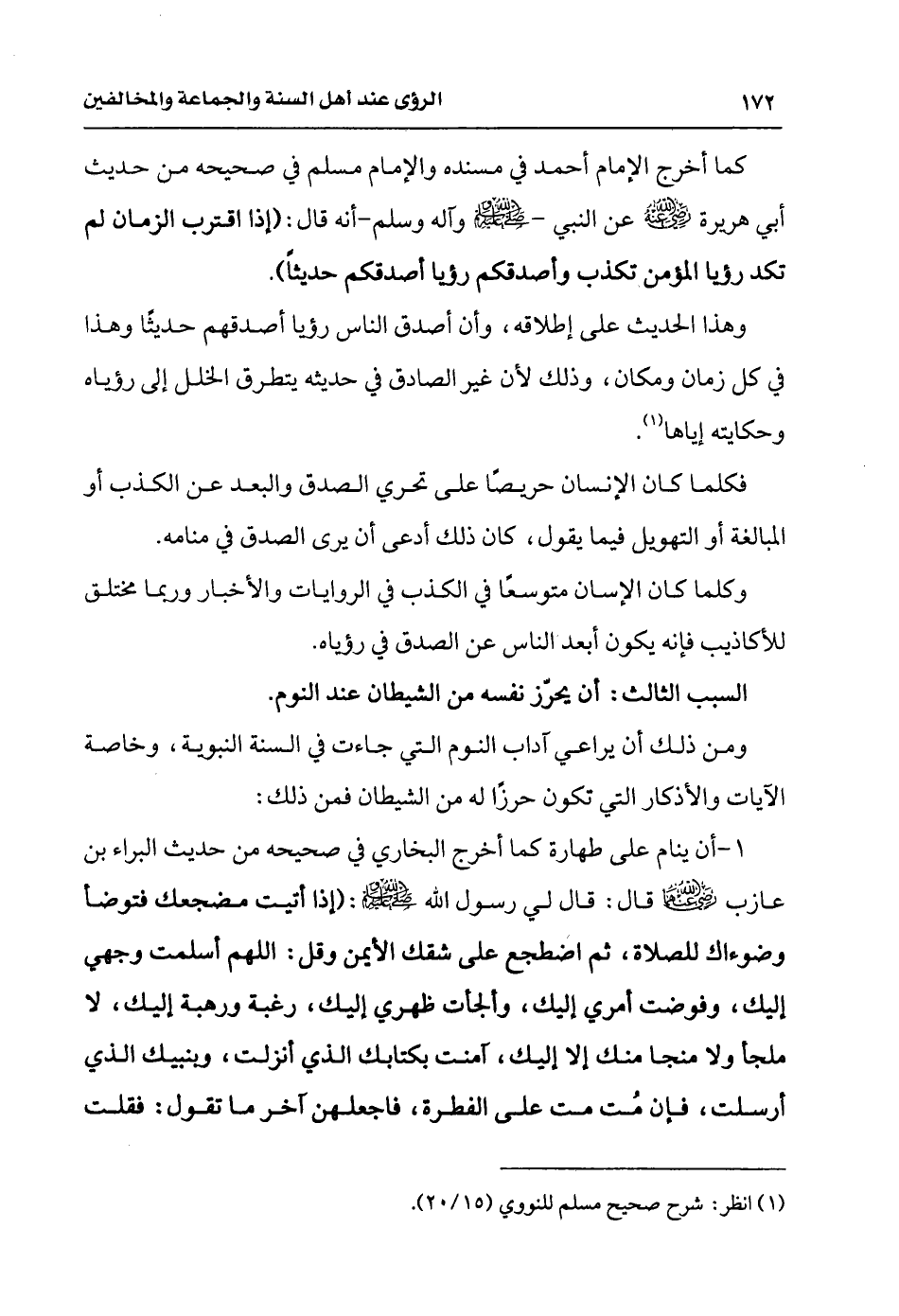كما أخرج الإمام أحمد في مسنده والإمام مسلم في صحيحه من حديث أبي هريرة رضي الله عنه عن النبي صلى الله عليه وآله وسلم أنه قال: «إذا اقترب الزمان لم تكد رؤيا المؤمن تكذب وأصدقكم رؤيا أصدقكم حديثًا».