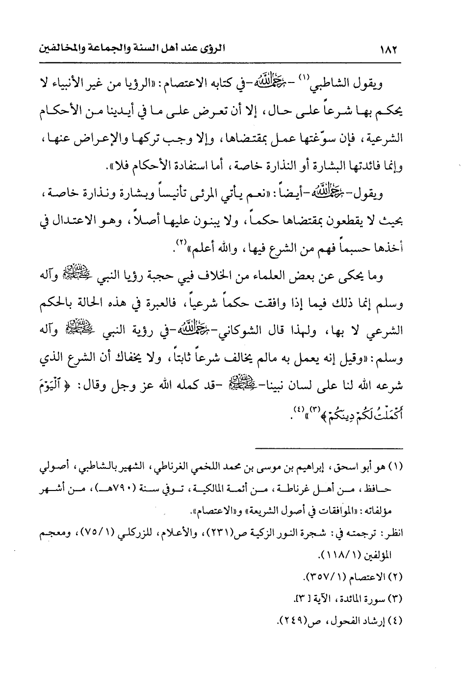 ويقول الشاطبي (¬1) رحمه الله في كتابه الاعتصام: (الرؤيا من غير الأنبياء لا يحكم بها شرعًا على حال، إلا أن تعرض على ما في أيدينا من الأحكام الشرعية، فإن سوغتها عمل بمقتضاها، وإلا وجب تركها والإعراض عنها، وإنما فائدتها البشارة أو النذارة خاصة، أما استفادة الأحكام فلا).