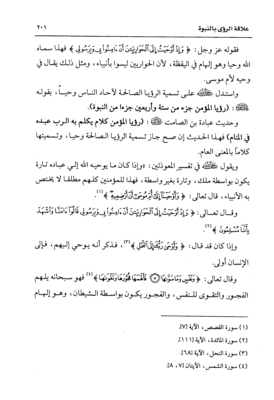 واستدل رحمه الله على تسمية الرؤيا الصالحة لآحاد الناس وحيًا، بقوله - صلى الله عليه وسلم -: «رؤيا المؤمن جزء من ستة وأربعين جزءًا من النبوة».