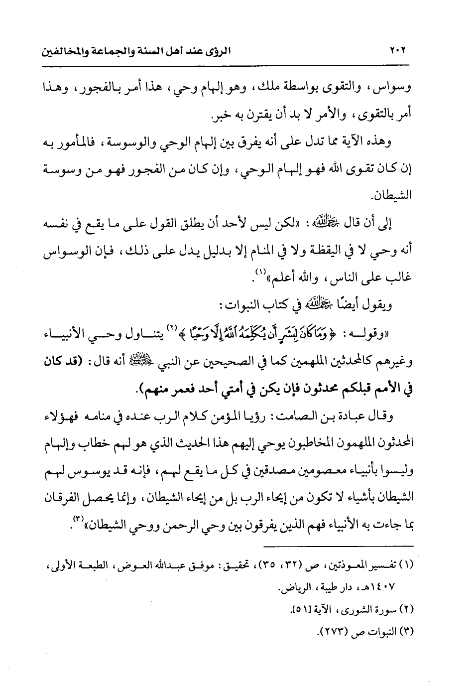 وقوله: {وَمَا كَانَ لِبَشَرٍ أَنْ يُكَلِّمَهُ اللهُ إِلَّا وَحْيًا} [الشورى: 51] يتناول وحي الأنبياء وغيرهم كالمحدثين الملهمين كما في الصحيحين عن النبي - صلى الله عليه وسلم - أنه قال: «قد كان في الأمم قبلكم محدثون فإن يكن في أمتي أحد فعمر منهم».