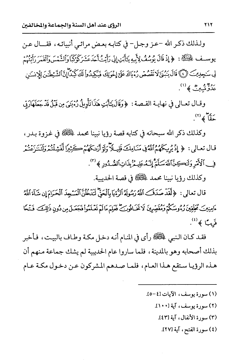 وكذلك ذكر الله سبحانه في كتابه قصة رؤيا نبينا محمد - صلى الله عليه وسلم - في غزوة بدر؛ قال تعالى: {إِذْ يُرِيكَهُمُ اللهُ فِي مَنَامِكَ قَلِيلًا وَلَوْ أَرَاكَهُمْ كَثِيرًا لَفَشِلْتُمْ وَلَتَنَازَعْتُمْ فِي الْأَمْرِ وَلَكِنَّ اللهَ سَلَّمَ إِنَّهُ عَلِيمٌ بِذَاتِ الصُّدُورِ} [الأنفال: 43].