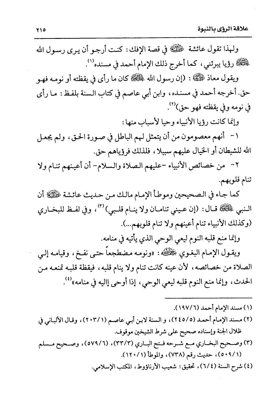 ويقول معاذ رضي الله عنه: إن رسول الله - صلى الله عليه وسلم - كان ما رأى في يقظته أو نومه فهو حق. أخرجه أحمد في مسنده، وابن أبي عاصم في كتاب السنة بلفظ: ما رأى في نومه وفي يقظته فهو حق (¬2).