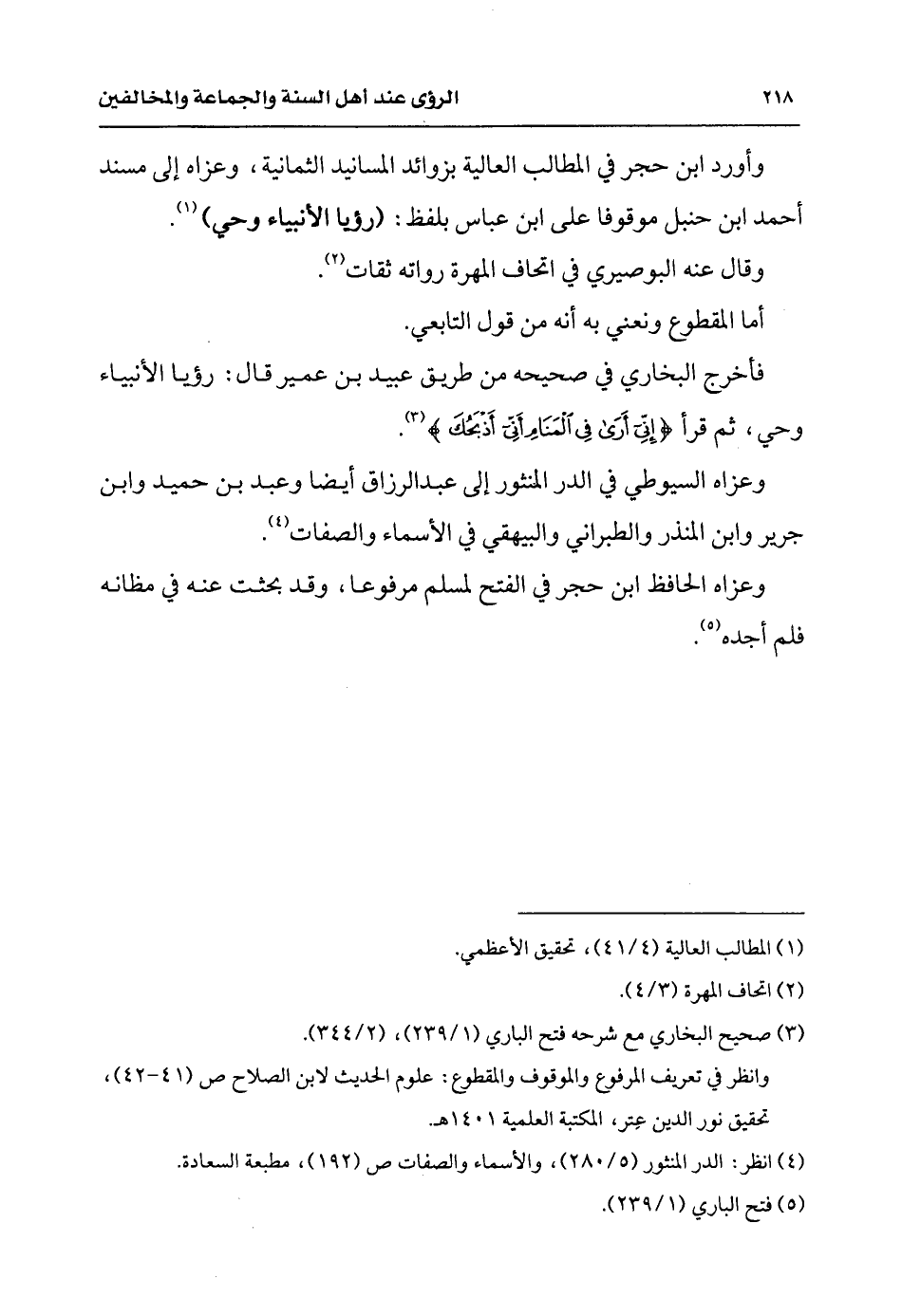 وأورد ابن حجر في المطالب العالية بزوائد المسانيد الثمانية، وعزاه إلى مسند أحمد بن حنبل موقوفًا على ابن عباس بلفظ: «رؤيا الأنبياء وحي» (¬1).