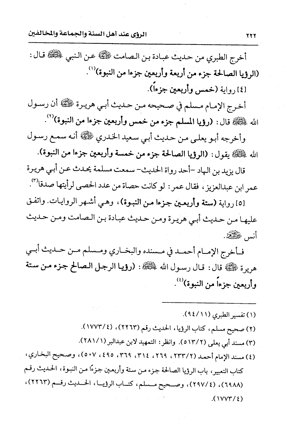 (¬4) مسند الإمام أحمد (2/ 223، 269، 314، 369، 495، 507) وصحيح البخاري، كتاب التعبير، باب الرؤيا الصالحة جزء من ستة وأربعين جزءًا من النبوة، الحديث رقم (6988) (4/ 297) وصحيح مسلم كتاب الرؤيا, الحديث رقم (2263) (4/ 1773).
