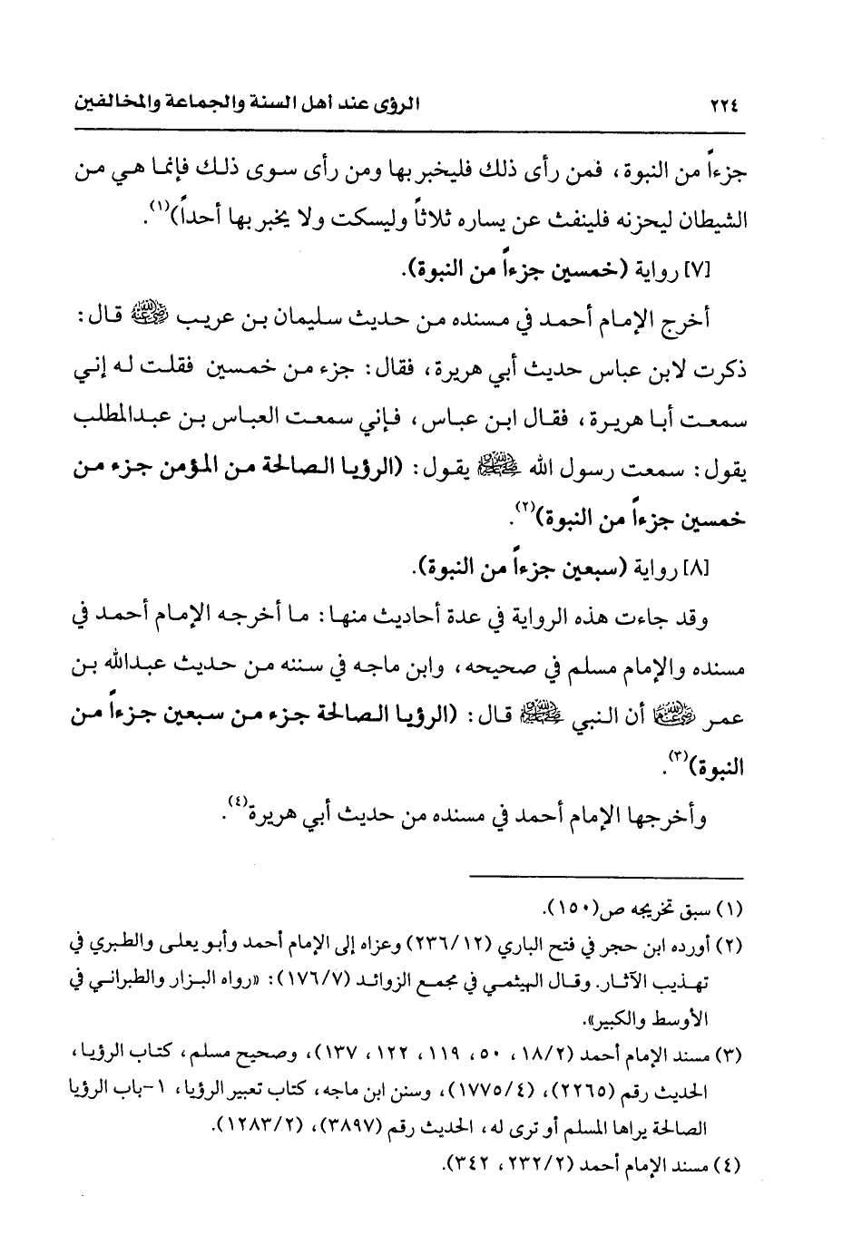 (¬3) مسند الإمام أحمد (2/ 18، 50، 119، 122، 137) وصحيح مسلم كتاب الرؤيا, الحديث رقم (2265) (4/ 1775) وسنن ابن ماجة، كتاب تعبير الرؤيا، 1 - باب الرؤيا الصالحة يراها المسلم أو ترى له، الحديث رقم (3897) (2/ 1283).