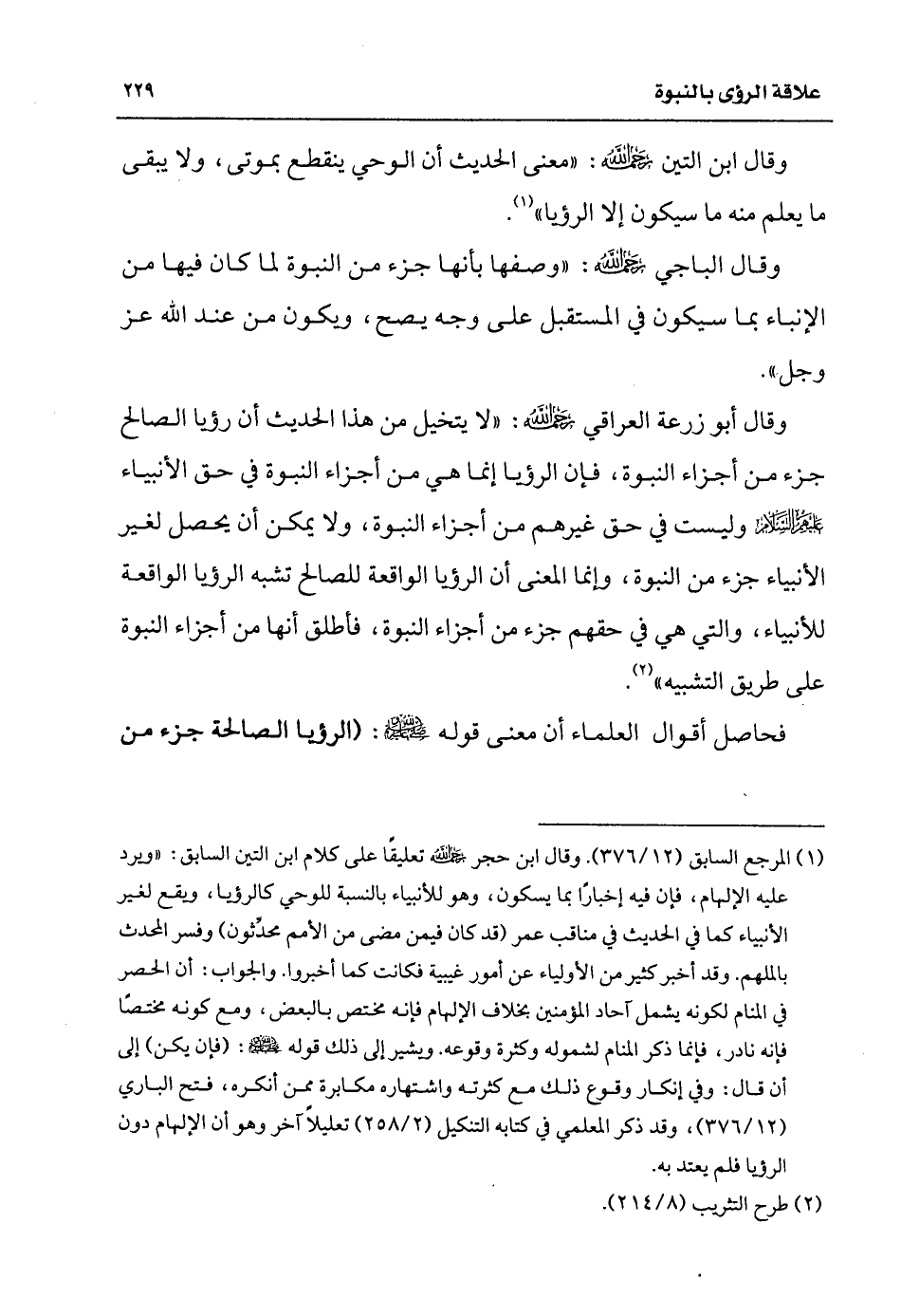 (¬1) المرجع السابق (12/ 376) وقال ابن حجر رحمه الله تعليقًا على كلام ابن التين السابق: ويرد عليه الإلهام فإن فيه إخبارًا بما سيكون وهو للأنبياء بالنسبة للوحي كالرؤيا، ويقع لغير الأنبياء كما في الحديث في مناقب عمر «قد كان فيمن مضى من الأمم محدثون» وفسر المحدث بالملهم وقد أخبر كثير من الأولياء عن أمور غيبية, فكانت كما أخبروا. والجواب: أن الحصر في المنام لكونه يشمل آحاد المؤمنين بخلاف الإلهام فإنه مختص بالبعض، ومع كونه مختصًا فإنه نادر، فإنما ذكر المنام لشموله وكثرة وقوعه، ويشير إلى ذلك قوله - صلى الله عليه وسلم - فإن يكن، إلى أن قال: وفي إنكار وقوع ذلك مع كثرته واشتهاره مكابرة ممن أنكره، فتح الباري (12/ 376) وقد ذكر المعلمي في كتابه التنكيل (2/ 258) تعليلاً آخر وهو أن الإلهام دون الرؤيا فلم يعتد به.