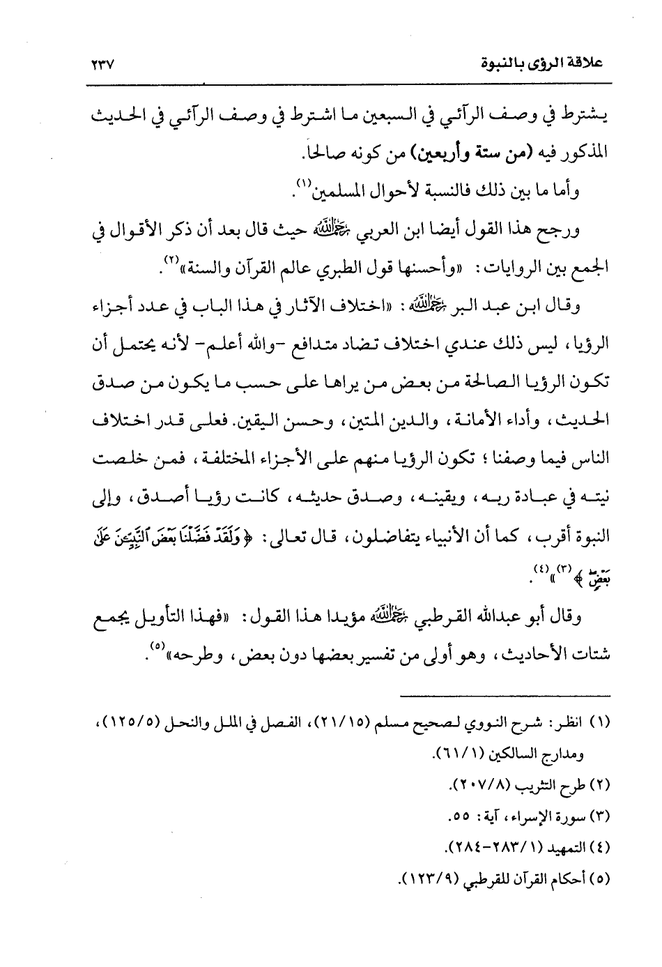 وقال ابن عبد البر رحمه الله: اختلاف الآثار في هذا الباب في عدد أجزاء الرؤيا ليس ذلك عندي اختلاف تضاد متدافع والله أعلم، لأنه يحتمل أن تكون الرؤيا الصالحة من بعض من يراها على حسب ما يكون من صدق الحديث، وأداء الأمانة والدين المتين، وحسن اليقين، فعلى قدر اختلاف الناس فيما وصفنا؛ تكون الرؤيا منهم على الأجزاء المختلفة، فمن خلصت نيته في عبادة ربه، ويقينه وصدق حديثه كانت رؤياه أصدق، وإلى النبوة أقرب، كما أن الأنبياء يتفاضلون قال تعالى: {وَلَقَدْ فَضَّلْنَا بَعْضَ النَّبِيِّينَ عَلَى بَعْضٍ} [الإسراء: 55] (¬3).
