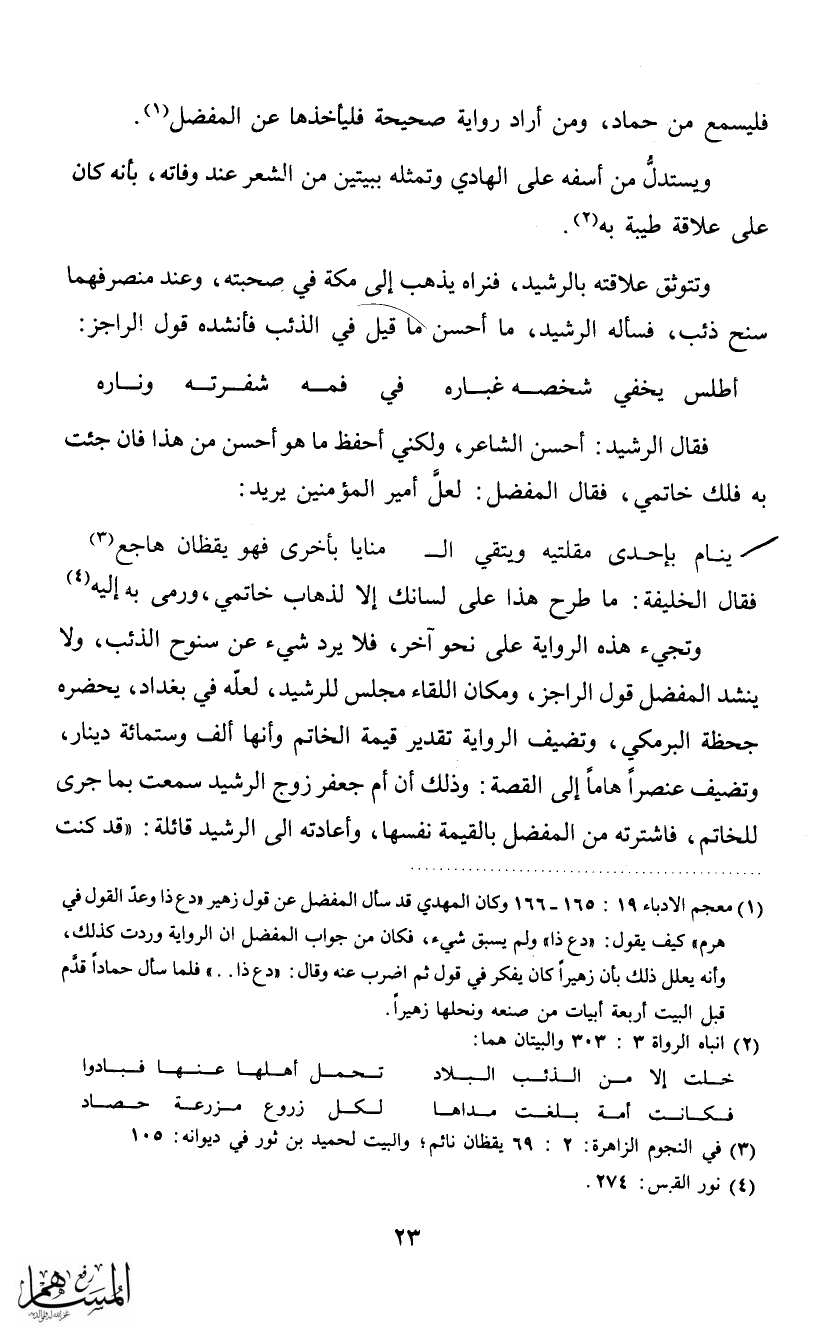وقد جعلته الحياة القائمة على الرواية طلعة كثير التسآل، لا في شؤون الشعر والأخبار بل في أمور الحياة عامة (3) ، ويدل حواره مع راوية الكميت (محمد ابن سهل) على أنه لم يكن يرضى بقبول شيء دون محاكمة؛ فقد وصف الكميت الرخمة بالكياسة مخالفاً كل من وصفها بالحمق (4) ، فيعلل محمد بن سهل ذلك بأن كيسها يظهر في حفظ فراخها واختيارها المساكن التي لا تبلغها سباع الطير، فيقول المفضل: نحن لا نعرف طائراً ألأم لؤماً ولا أقذر طعمة ولا أظهر موقاً منها، فيرد عليه ابن سهل منكراً حمقها، لأنها تحضن بيضها وتحمي فراخها وتحب ولدها وتقطع في أول القواطع وترجع في أول الرواجع (5) . ولا ينتهي هذا الجدل - فيما يبدو - إلى اتفاق.