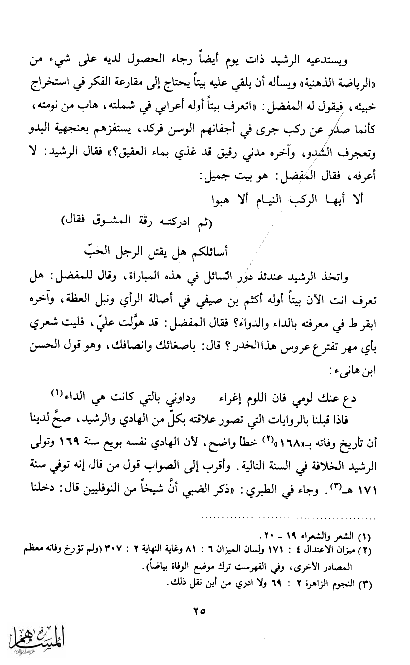 زعموا أن كل من ضرب العي؟ ... ر موالٍ لنا وأنا الولاء بينما يرى غيره أن العير قد ينطلق إلى كليب أو قد يعني الحمار (2) . وإذا مر به بيت عمرو بن كلثوم ((وسيد معشر قد توجوه)) قال: إنما سمي سيداً لأنه كان يسودهم في العطاء ويهشم الثريد (3) . ويمر بلفظة ((قيل)) فيقول: هو الملك وجمعه أقيال أو قوال (4) ؛ ويوجه دلالة ((معد)) في قول عمرو بن كلثوم ((وقد علم القبائل من معدّ)) بأنه معد بن بكر (5) ؛ وإذا تذكرنا أن المفضل يروي عن الأعراب أمثال أبي العدرج وأبي الغول (6) لم نصدق أنه كان يأخذ الشعر دون أن يسألهم عن معانيه. قال تلميذه أبو زيد: كنا يوماً عند المفضل وعنده الأعراب فقلت لهم، قل لهم: يحقرونها فقالوا: شييرة (7) ؛ وللمفضل وقفات لغوية واضحة، تدل على اطلاع واسع ومعرفة دقيقة، فهو يقول إن ورى الزند ووري لغتان (8) ، وإن الناموس هو الذي يتعرف الأخبار وينقر عنها (9) ،