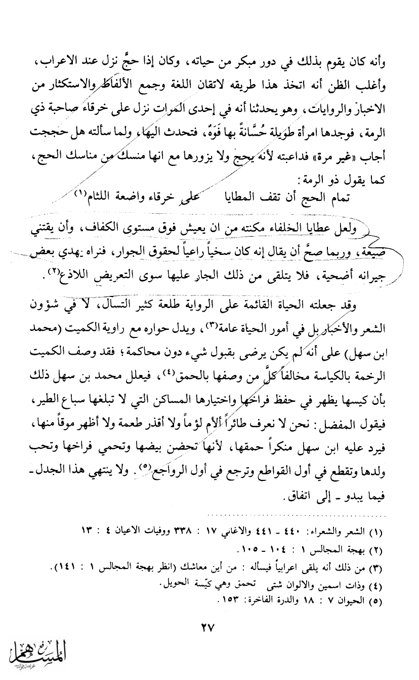 ليستلبن أبداناً وبيضاً ... وأسرى في الحديد مقيدينا قال: ليس هو من هذه القصيدة (3) ؛ فإذا غمض عليه المنحول من الصحيح في شعر عدي بن زيد، فذلك ليس غريباً، لا سيما وهو مخلص ((لمدرسة الكوفية)) التي لم تكن تتشدد في قبول الاتساع في رواية الشعر.