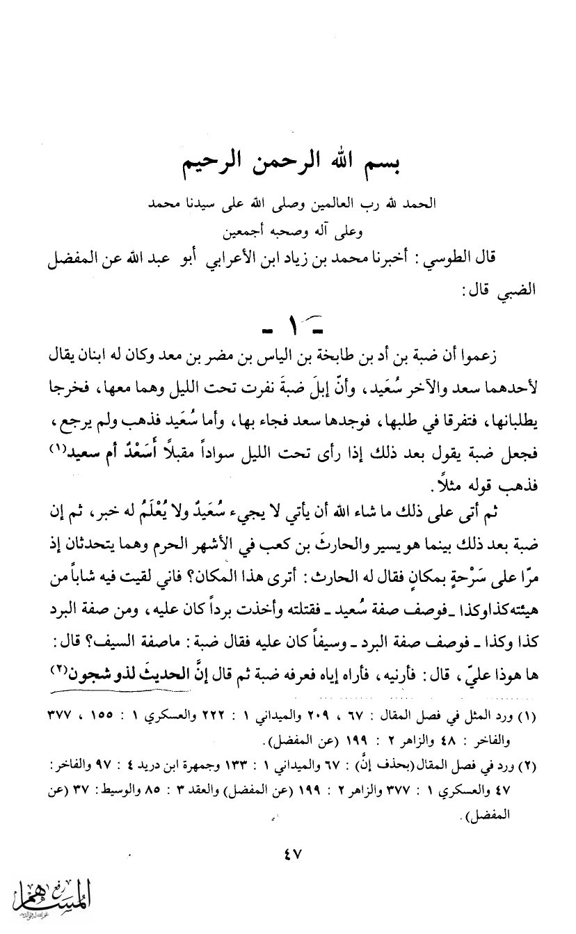 قال الطوسي: أخبرنا محمد بن زياد ابن الأعرابي أبو عبد الله عن المفضل الضبي قال: