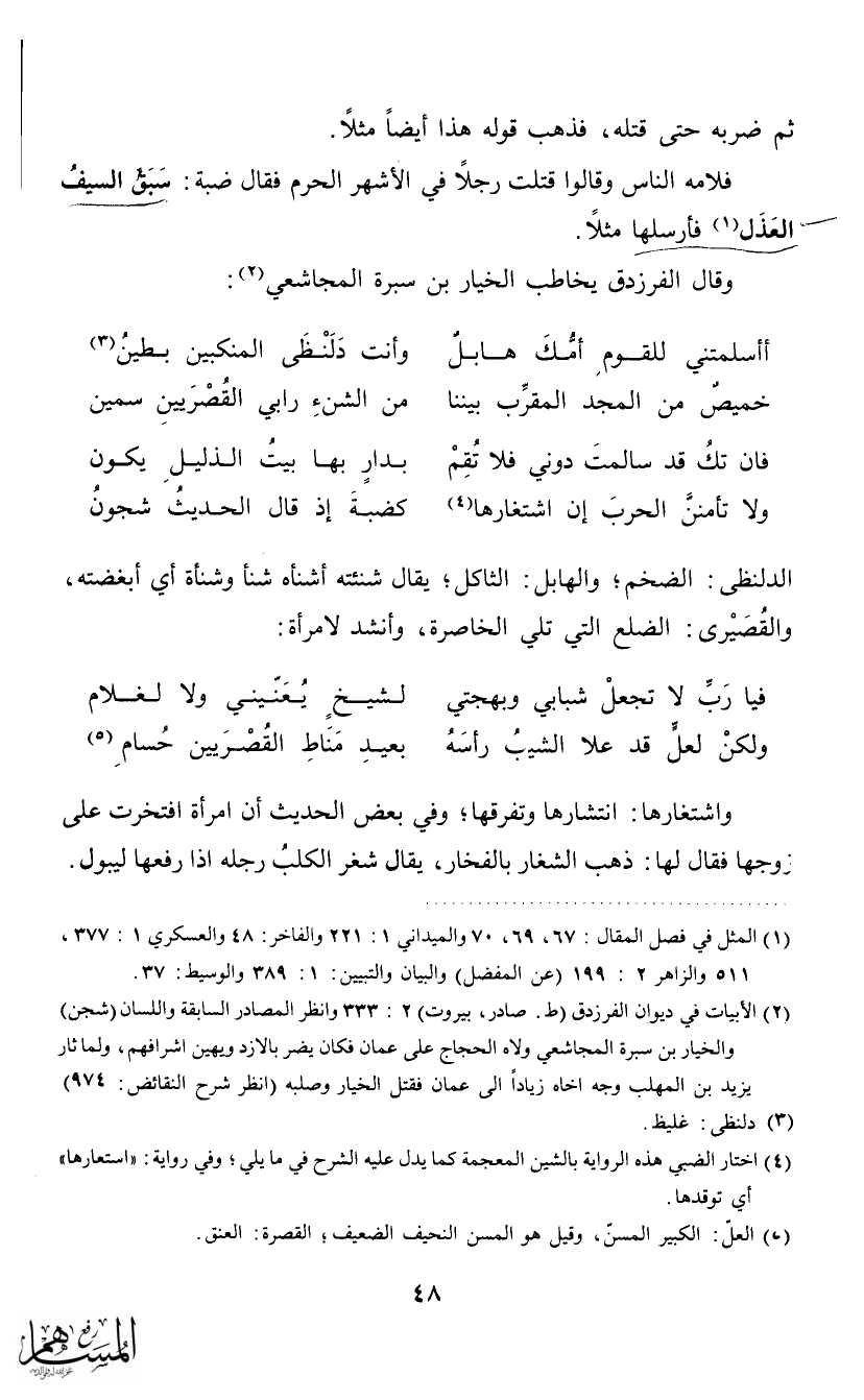 (1) المثل في فصل المقال: 67، 69 70 والميداني 1: 221 والفاخر: 48 والعسكري 1: 377، 511 والزاهر 2: 199 (عن المفضل) والبيان والتبيين 1: 389 والوسيط: 37.
