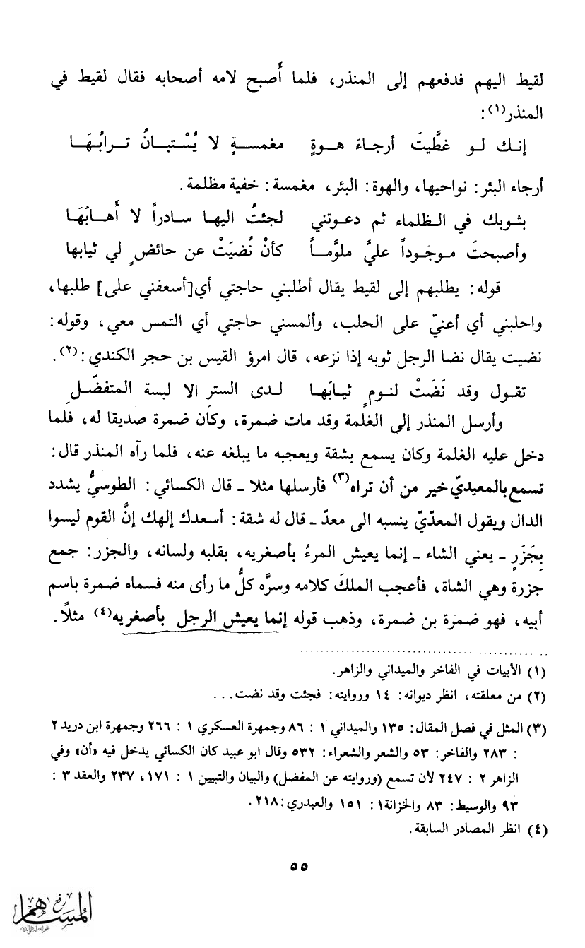 تقول وقد نضت لنومٍ ثيابها ... لدى الستر إلا لبسة المتفضل وأرسل المنذر إلى الغلمة وقد مات ضمرة، وكان ضمرة صديقاً له، فلما دخل عليه الغلمة وكان يسمع بشقة ويعجبه ما يبلغه عنه، فلما رآه المنذر قال: تسمع بالمعيدي خير من أن تراه (3) فأرسلها مثلا - قال الكسائي: الطوسي يشدد الدال ويقول المعدي ينسبه إلى معد - قال له شقة: أسعدك إلهك إن القوم ليسوا بجزر - يعني الشاء - إنما يعيش المرء بأصغريه، بقلبه ولسانه، والجزر: جمع جزرة وهي الشاة، فاعجب الملك كلامه وسره كل ما رأى منه فسماه ضمرة باسم أبيه، فهو ضمرة بن ضمرة، وذهب قوله إنما يعيش الرجل بأصغريه (4) مثلاً.