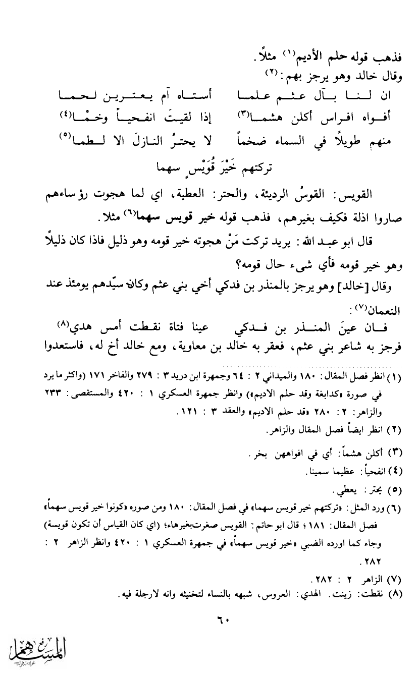 منهم طويلاً في السماء ضخماً ... (5) لا يحتر النازل إلا لطما تركتهم خير قويس سهما ... القويس: القوس الرديئة، والحتر: العطية، أي لما هجوت رؤساءهم صاروا أذلة فكيف بغيرهم، فذهب قوله خير قويس سهما (6) مثلاً.