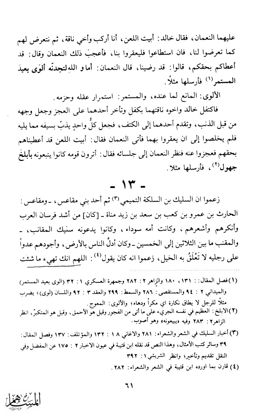 (3) أخبار السليك في الشعر والشعراء: 281 والأغاني 18: 132 والمؤتلف: 137 وفصل المقال: 39 وسائر كتب الأمثال، وهذا النص قد نقله ابن قتيبة في عيون الأخبار 2: 175 عن المفضل وفي النقل تقديم وتأخير؛ وانظر الشربشي 1: 392.