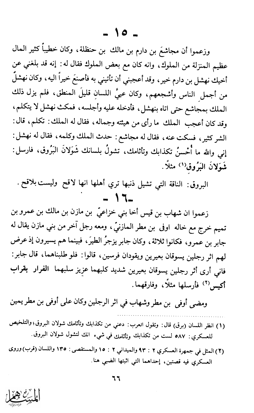 وزعموا أن مجاشع بن دارم بن مالك بن حنظلة، وكان خطيباً كثير المال عظيم المنزلة من الملوك، وانه كان مع بعض الملوك فقال له: إنه قد بلغني عن أخيك نهشل بن دارم خير، وقد أعجبني أن تأتيني به فأصنع خيراً إليه، وكان نهشل من أجمل الناس وأشجعهم، وكان عيي اللسان قليل المنطق، فلم يزل ذلك الملك بمجاشع حتى اتاه بنهشل، فأدخله عليه وأجلسه، فمكث نهشل لا يتكلم، وقد كان أعجب الملك ما رأى من هيئته وجماله، فقال له الملك: تكلم، قال: الشر كثير، فسكت عنه، فقال له مجاشع: حدث الملك وكلمه، فقال له نهشل: إني والله ما أحسن تكذابك وتأثامك، تشول بلسانك شولان البروق، فارسل: شولان البروق (1) مثلاً.