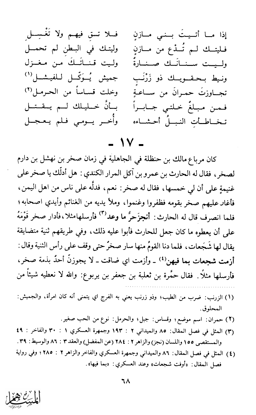 كان مرباع مالك بن حنظلة في الجاهلية في زمان صخر بن نهشل بن دارم لصخر، فقال له الحارث بن عمرو بن آكل المرار الكندي: هل أدلك يا صخر على غنيمة على أن لي خمسها، فقال له صخر: نعم، فدله على ناس من أهل اليمن، فأغار عليهم صخر بقومه فظفروا وغنموا، وملأ يديه من الغنائم وأيدي أصحابه؛ فلما انصرف قال له الحارث: أنجز حر ما وعد (3) فأرسلها مثلا، فادار صخر قومه على أن يعطوه ما كان جعل للحارث فأبوا عليه ذلك، وفي طريقهم ثنية متضايقة يقال لها شجعات فلما دنا القوم منها سار صخر حتى وقف على رأس الثنية وقال: أزهت شجعات بما فيهن (4) - وأزمت أي ضاقت - لا يجوزن أحد بذمة صخر، فأرسلها مثلاً. فقال حمرة بن ثعلبة بن جعفر بن يربوع: والله لا نعطيه شيئاً من