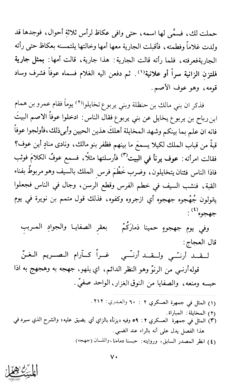 فذكر أن بني مالك بن حنظلة وبني يربوع تخايلوا (2) يوماً فقام عمرو بن همام ابن رباح بن يربوع يخايل عن بني يربوع فقال الناس: ادخلوا عوفاً الأصم البيت فإنه إن علم بما بينكم وشهد المخايلة أهلك هذين الحيين وأبى ذلك، فأولجوا عوفاً قبة من قباب الملك لكيلا يسمع ما بينهم فظفر بنو مالك، ونادى مناد أين عوف؟ فقالت امرأته: عوف يرنا في البيت فأرسلتها مثلاً، فسمع عوف الكلام فوثب فإذا الناس فئتان يتخايلون، وضرب خطم فرس الملك بالسيف وهو مربوط بفناء القبة، فنشب السيف في خطم الفرس وقطع الرسن، وجال في الناس فجعلوا يقولون جهجوه جهجوه أي ازجروه وكفوه، فذلك قول متمم بن نويرة في يوم جهجوه: