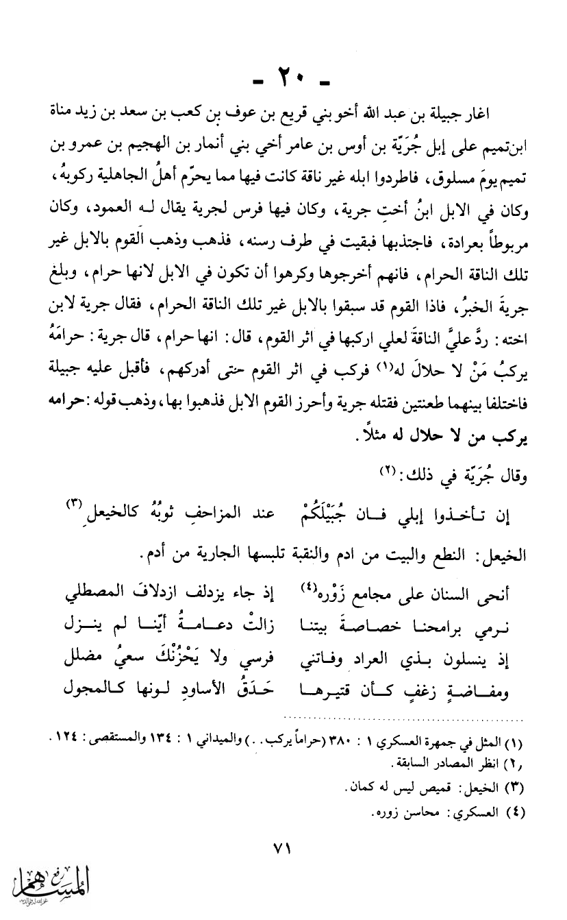 أغار جبيلة بن عبد الله أخو بني قريع بن عوف بن كعب بن سعد بن زيد مناة ابن تميم على إبل جرية بن أوس بن عامر أخي بني أنمار بن الهجيم بن عمرو بن تميم يوم مسلوق، فاطردوا ابله غير ناقة كانت فيها مما يحرم أهل الجاهلية ركوبه، وكان في الابل ابن أخت جرية، وكان فيها فرس لجرية يقال له العمود، وكان مربوطاً بعرادة، فاجتذبها فبقيت في طرف رسنه، فذهب وذهب القوم بالابل غير تلك الناقة الحرام، فإنهم أخرجوها وكرهوا أن تكون في الابل لأنها حرام، وبلغ جرية الخبر، فإذا القوم قد سبقوا بالابل غير تلك الناقة الحرام، فقال جرية لابن أخته: رد علي الناقة لعلي اركبها في أثر القوم، قال: إنها حرام، قال جرية: حرامه يركب من لا حلال له فركب في أثر القوم حتى أدركهم، فأقبل عليه جبيلة فاختلفا بينهما طعنتين فقتله جرية وأحرز القوم الابل فذهبوا بها، وذهب قوله: حرامه يركب من لا حلال له مثلاً.