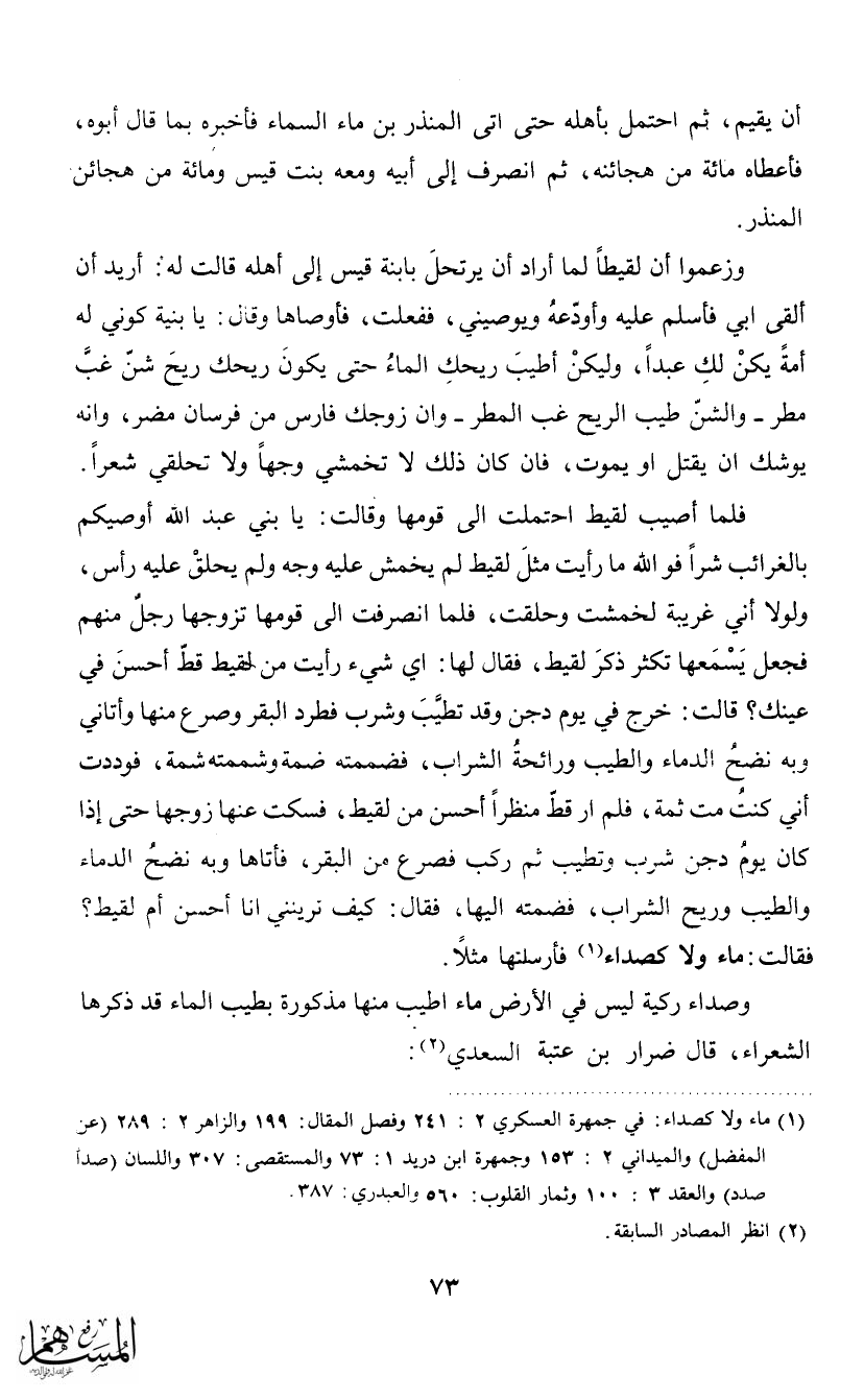 (1) ماء ولا كصداء: في جمهرة العسكري 2: 241 وفصل المقال: 199 والزاهر 2: 289 (عن المفضل) والميداني 2: 153 وجمهرة ابن دريد 1: 73 والمستقصي: 307 واللسان (صدأ صدد) والعقد 3: 100 وثمار القلوب: 560 والعبدري: 387.