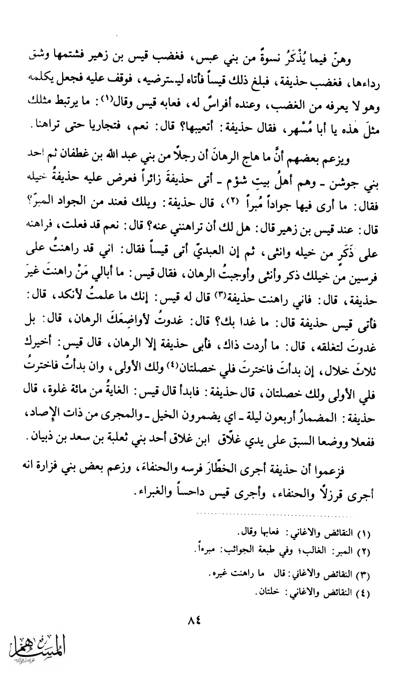 ويزعم بعضهم أن ما هاج الرهان أن رجلاً من بني عبد الله بن غطفان ثم احد بني جوشن - وهم أهل بيت شؤم - أتى حذيفة زائراً فعرض عليه حذيفة خيله فقال: ما رأى فيها جواداً مبراً (2) ، قال حذيفة: ويلك فعند من الجواد المبر؟ قال: عند قيس بن زهير قال: هل لك أن تراهنني عنه؟ قال: نعم قد فعلت، فراهنه على ذكرٍ من خيله وانثى، ثم إن العبدي أتى قيساً فقال: اني قد راهنت على فرسين من خيلك ذكر وانثى وأوجبت الرهان، فقال قيس: ما أبالي من راهنت غير حذيفة، قال: فاني راهنت حذيفة (3) قال له قيس: إنك ما علمت لأنكد، قال: فأتى قيس حذيفة قال: ما غدا بك؟ قال: غدوت لأواضعك الرهان، قال: بل غدوت لتغلقه، قال: ما أردت ذاك، فأبى حذيفة إلا الرهان، قال قيس: أخيرك ثلاث خلال، إن بدأت فاخترت فلي خصلتان (4) ولك الأولى، وان بدأت فاخترت فلي الأولى ولك خصلتان، قال حذيفة: فابدأ قال قيس: الغاية من مائة غلوة، قال حذيفة: المضمار أربعون ليلة - اي يضمرون الخيل - والمجرى من ذات الإصاد، ففعلا ووضعا السبق على يدي غلاق ابن غلاق أحد بني ثعلبة بن سعد بن ذبيان.