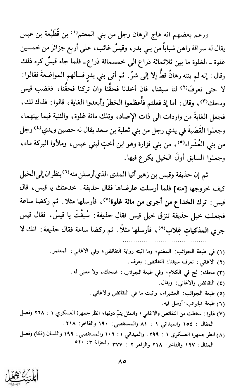 ثم إن حذيفة وقيس بن زهير أتيا المدى الذي أرسلن منه (6) ينظران إلى الخيل كيف خروجها منه فلما أرسلت عارضاها فقال حذيفة: خدعتك يا قيس، قال قيس: ترك الخداع من أجرى من مائة غلوة (7) ، فأرسلها مثلا. ثم ركضا ساعة فجعلت خيل حذيفة تنزق خيل قيس فقال حذيفة: سبقت يا قيس، فقال قيس جري المذكيات غلاب (8) ، فأرسلها مثلاً. ثم ركضا ساعة فقال حذيفة: انك لا