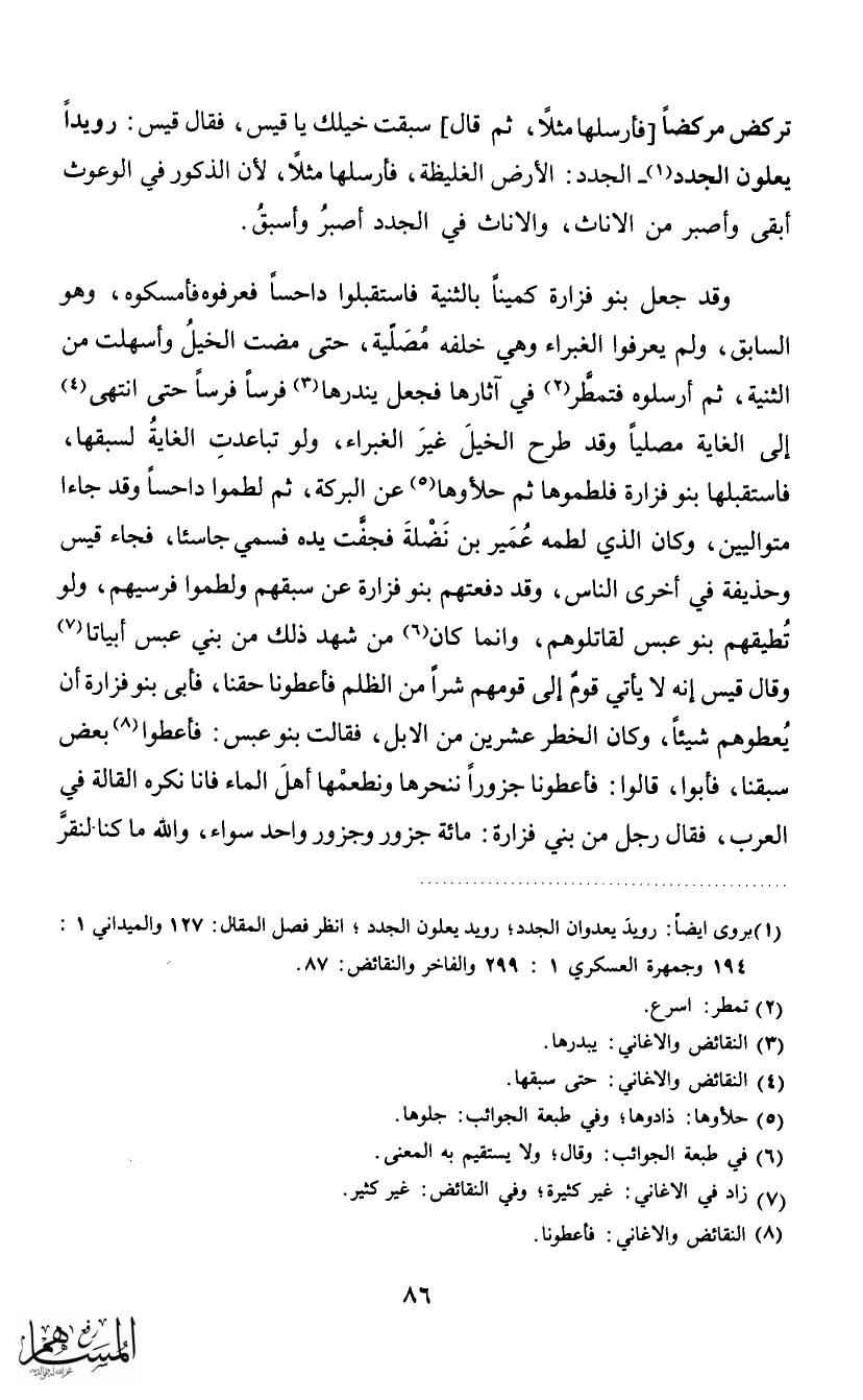 وقد جعل بنو فزارة كميناً بالثنية فاستقبلوا داحساً فعرفوه فأمسكوه، وهو السابق، ولم يعرفوا الغبراء وهي خلفه مصلية، حتى مضت الخيل وأسهلت من الثنية، ثم أرسلوه فتمطر (2) في آثارها فجعل يندرها (3) فرساً فرساً حتى انتهى (4) إلى الغاية مصلياً وقد طرح الخيل غير الغبراء، ولو تباعدت الغاية لسبقها، فاستقبلها بنو فزارة فلطموها ثم حلأوها (5) عن البركة، ثم لطموا داحساً وقد جاءا متواليين، وكان الذي لطمه عمير بن نضلة فجفت يده فسمي جاسئا، فجاء قيس وحذيفة في أخرى الناس، وقد دفعتهم بنو فزارة عن سبقهم ولطموا فرسيهم، ولو تطيقهم بنو عبس لقاتلوهم، وانما كان (6) من شهد ذلك من بني عبس ابياتا (7) وقال قيس إنه لا يأتي قوم إلى قومهم شراً من الظلم فأعطونا حقنا، فأبى بنو فزارة أن يعطوهم شيئاً، وكان الخطر عشرين من الابل، فقالت بنو عبس: فأعطوا (8) بعض سبقنا، فأبوا، قالوا: فأعطونا جزوراً ننحرها ونطعمها أهل الماء فانا نكره القالة في العرب، فقال رجل من بني فزارة: مائة جزور وجزرو واحد سواء، والله ما كنا لنقر