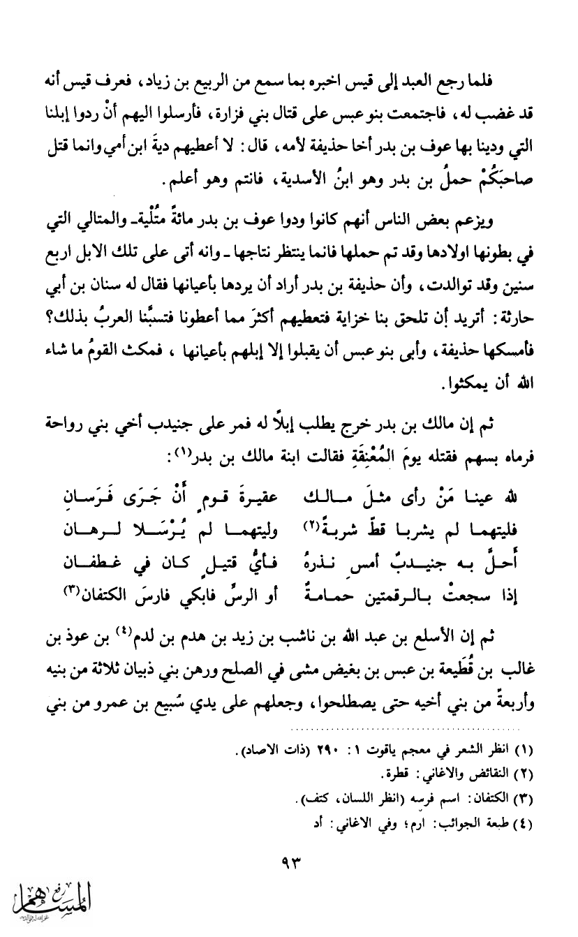إذا سجعت بالرقمتين حمامة ... أو الرس فابكي فارس الكتفان (3) ثم إن الأسلع بن عبد الله بن ناشب بن زيد بن هدم بن لدم (4) بن عوذ بن غالب بن قطيعة بن عبس بن بغيض مشى في الصلح ورهن بني ذيبان ثلاثة من بنيه وأربعة من بني أخيه حتى يصطلحوا، وجعلهم على يدي سبيع بن عمرو من بني