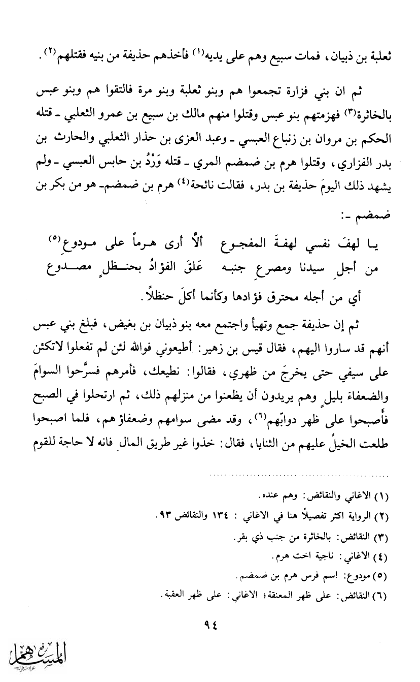ثم إن بني فزازة تجمعوا هم وبنو ثعلبة وبنو مرة فالتقوا هم وبنو عبس بالخاثرة (3) فهزمتهم بنو عبس وقتلوا منهم مالك بن سبيع بن عمرو الثعلبي - قتله الحكم بن مروان بن زنباع العبسي - وعبد العزى بد حذار الثعلبي والحارث بن بدر الفزاري، وقتلوا هرم بن ضمضم المري - قتله ورد بن حابس العبسي - ولم يشهد ذلك اليوم حذيفة بن بدر، فقالت نائحة (4) هرم بن ضمضم - هو من بكر بن ضمضم -: