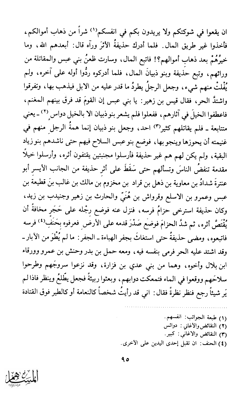 إن يقعوا في شوكتكم ولا يريدون بكم في أنفسكم (1) شراً من ذهاب أموالكم، فأخذوا غير طريق المال. فلما أدرك حذيفة الأثر ورآه قال: أبعدهم الله، وما خيرهم بعد ذهاب أموالهم؟؟؟؟؟؟ فاتبع المال، وسارت ظعن بني عبس والمقاتلة من ورائهم، وتبع حذيفة وبنو ذبيان المال، فلما أدركوه ردوا أوله على آخره، ولم يفلت منهم شيء، وجعل الرجل يطرد ما قدر عليه من الابل فيذهب بها، وتفرقوا واشتد الحر، فقال قيس بن زهير: يا بني عبس إن القوم قد فرق بينهم المغنم، فاعطفوا الخيل في آثارهم، ففعلوا فلم يشعر بنو ذبيان إلا بالخيل دواس (2) - يعني متتابعة - فلم يقاتلهم كثير (3) احد، وجعل بنو ذبيان إنما همة الرجل منهم في غنيمته أن يحوزها وينجو بها، فوضع بنو عبس السلاح فيهم حتى ناشدهم بنو زياد البقية، ولم يكن لهم هم غير حذيفة فأرسلوا مجنبتين يقتفون أثره، وأرسلوا خيلاً مقدمة تنفض الناس وتسألهم حتى سقط على أثر حذيفة من الجانب الأيسر أبو عنترة شداد بن معاوية بن ذهل بن قراد بن مخزوم بن مالك بن غالب بن قطيعة بن عبس وعمرو بن الاسلع وقرواش بن هني والحارث بن زهير وجنيدب بن زيد، وكان حذيفة استرخى حزام فرسه، فنزل عنه فوضع رجله على حجر مخافة أن يقتص أثره، ثم شد الحزام فوضع صدر قدمه على الأرض فعرفوه بحنف (4) فرسه فاتبعوه، ومضى حذيفة حتى استغاث بجفر الهباءة - الجفر: ما لم يطو من الآبار - وقد اشتد عليه الحر فرمى بنفسه فيه، ومعه حمل بن بدر وحنش بن عمرو وورقاء ابن بلال وأخوه، وهما من بني عدي بن فزارة، وقد نزعوا سروجهم وطرحوا سلاحهم ووقعوا في الماء فتمعكت دوابهم، وبعثوا ربيئة فجعل يطلع وينظر فاذا لم ير شيئاً رجع فنظر نظرة فقال: اني قد رأيت شخصاً كالنعامة أو كالطير فوق القتادة