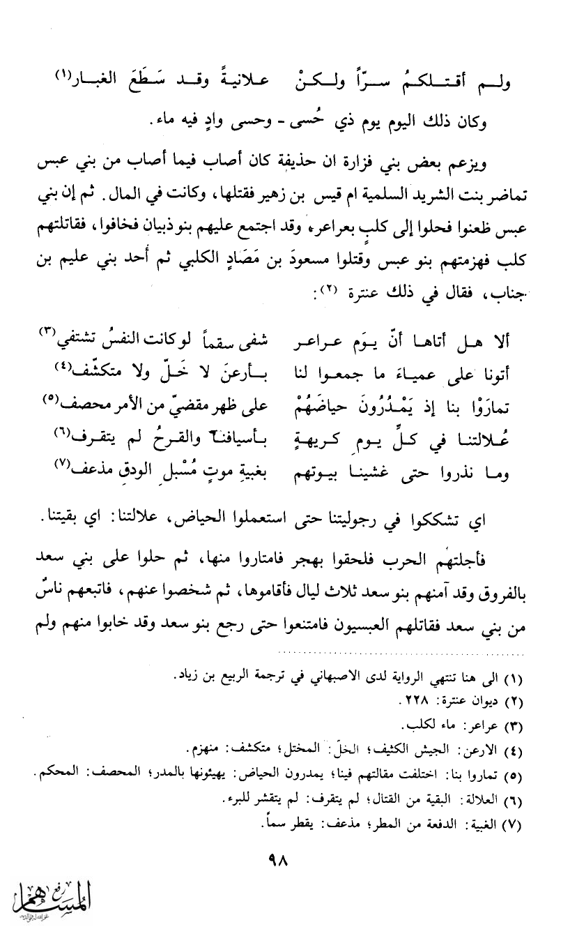 ويزعم بعض بني فزارة إن حذيفة كان أصاب فيما أصاب من بني عبس تماضر بنت الشريد السلمية ام قيس بن زهير فقتلها، وكانت في المال. ثم إن بني عبس ظعنوا فحلوا إلى كلب بعراعر، وقد اجتمع عليهم بنو ذبيان فخالفوا، فقاتلتهم كلب فهزمتهم بنو عبس وقتلوا مسعود بن مصاد الكلبي ثم أحد بني عليم بن جناب، فقال في ذلك عنترة (2) :