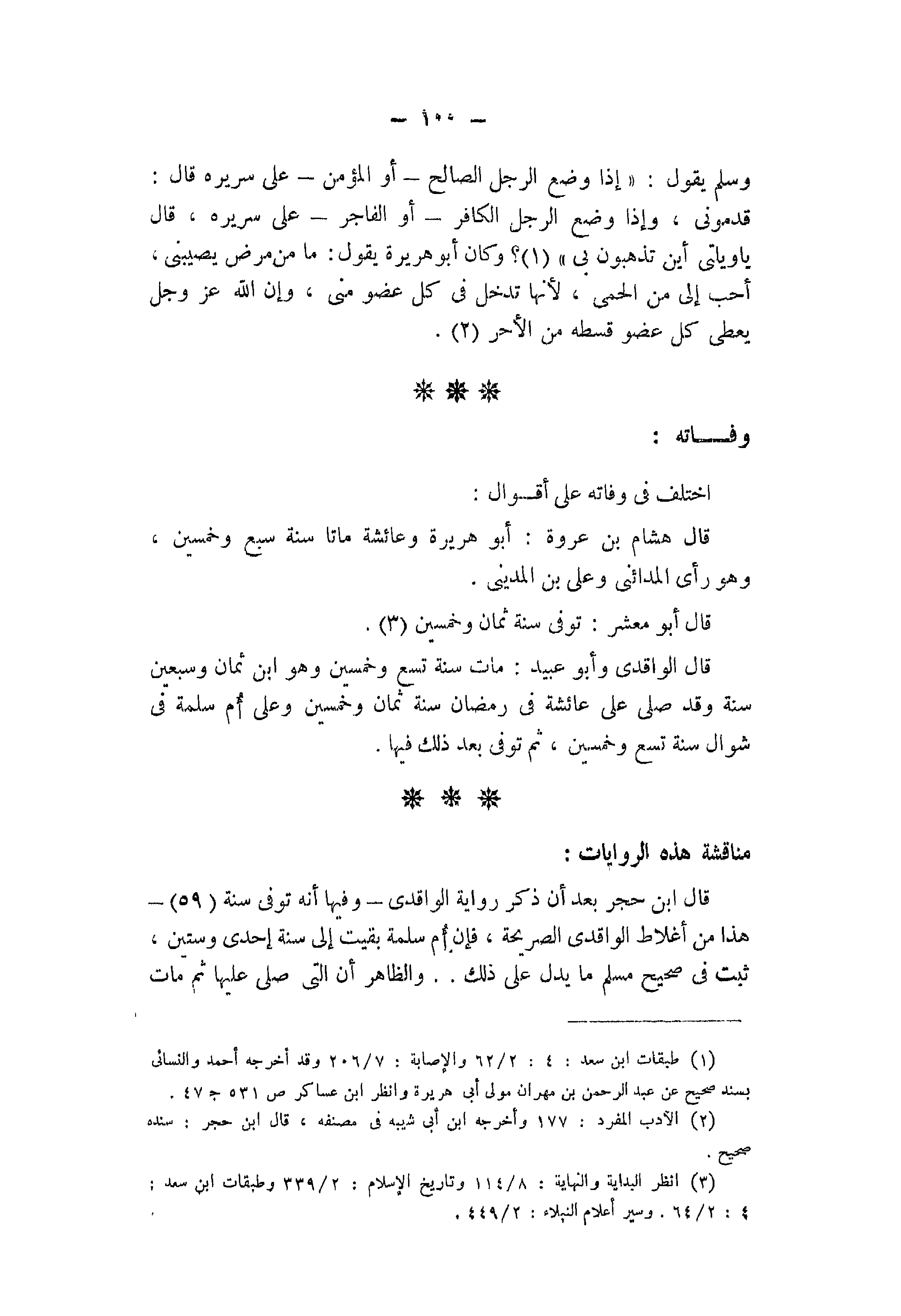 (3) انظر " البداية والنهاية ": ص 114، جـ 8. و " تاريخ الإسلام ": ص 339، جـ 2. و " طبقات ابن سعد ": 4: 2/ 64. و " سير أعلام النبلاء ": ص 449، جـ 2.