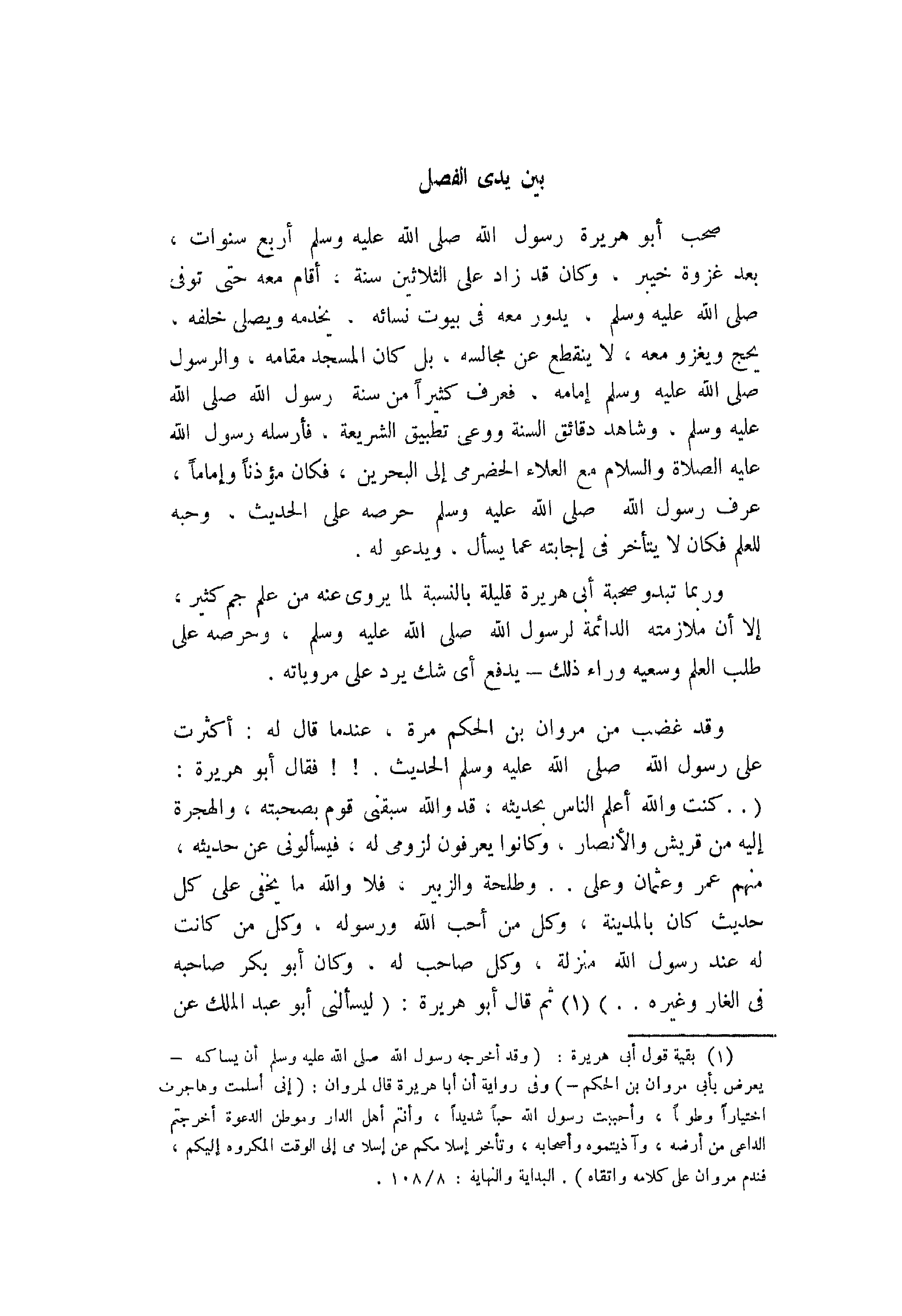 (1) بقية قول أبي هريرة: «وقد أخرجه رسول الله - صَلََّى اللهُ عَلَيْهِ وَسَلَّمَ - أن يساكنه - يعرض بأبي مروان بن الحكم -» وفي رواية أنَّ أبا هريرة قال لمروان: «إني أسلمت وهاجرت اختياراً وطوعاً، وأحببت رسول الله حبا شديداً، وأنتم أهل الدار وموطن الدعوة أخرجتم الداعي من أرضه، وآذيتموه وأصحابه، وتأخر إسلامكم عن إسلامي إلى الوقت المكروه إليكم»، فندم مروان على كلامه واتقاه. " البداية والنهاية ": ص 108، جـ 8.