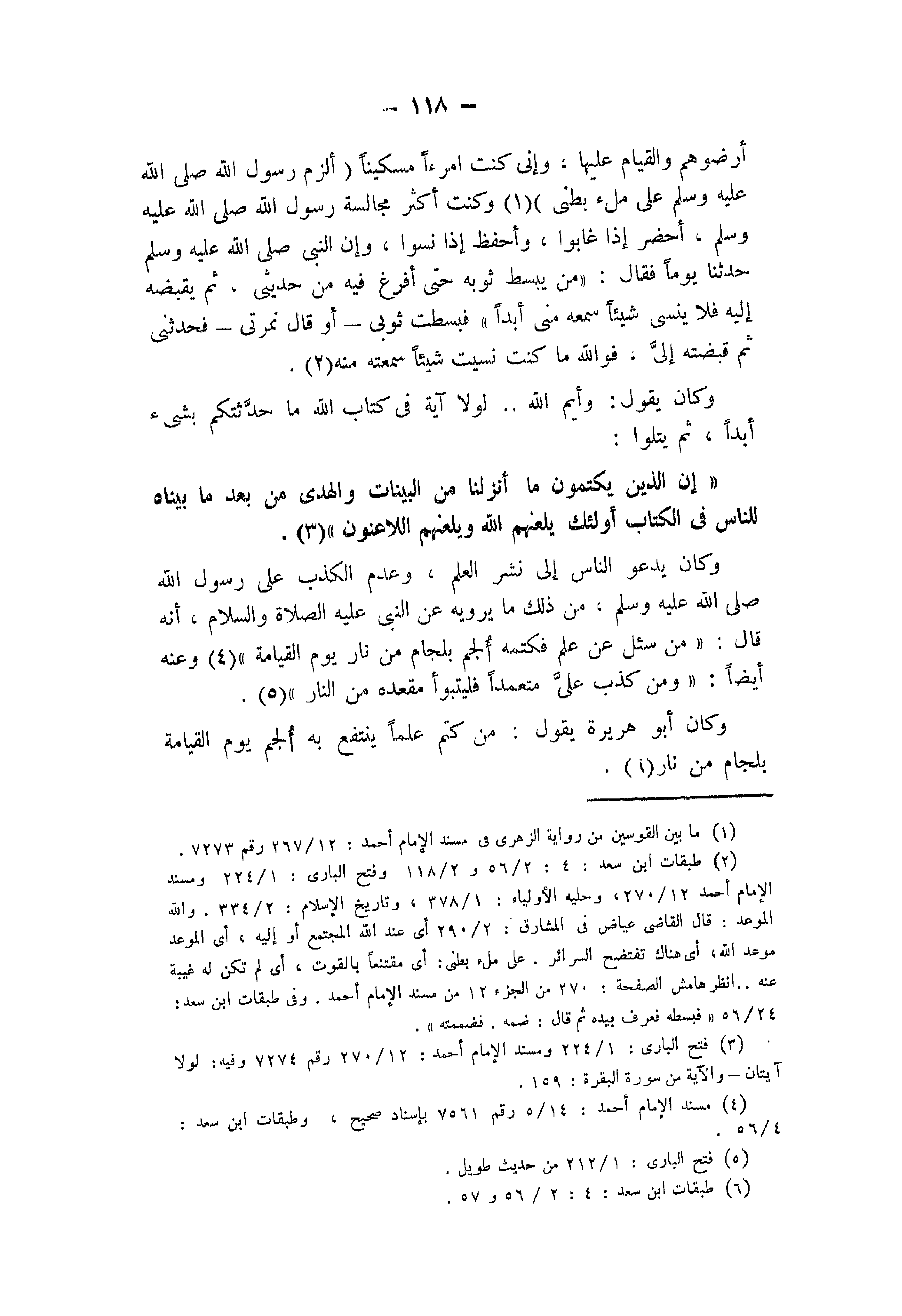 وكان أبو هريرة يقول: «مَنْ كَتَمَ عِلْماً يُنْتَفَعُ بِهِ، أُلْجِمَ يَوْمَ الْقِيَامَةِ بِلِجَامٍ مِنْ نَارٍ» (6).